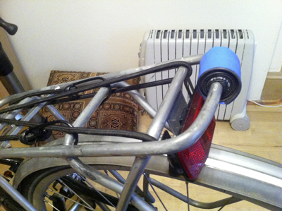 My final bike tasks for today were to replace the exhausted batteries in some of Lev’s skullies and knogs, and move his rear blinders (USB-charged lights). I had mounted the blinders on the saddle-post but using two panniers tends to occlude lights in this position. So I shimmed the pannier rack’s rear bar with bits of dead inner-tube, then positioned the blinders. (The other blinder was charging while I took the photos.) I’ve retained two rear skullies in case the blinders run out of charge, and repositioned the knogs on the saddle-post.