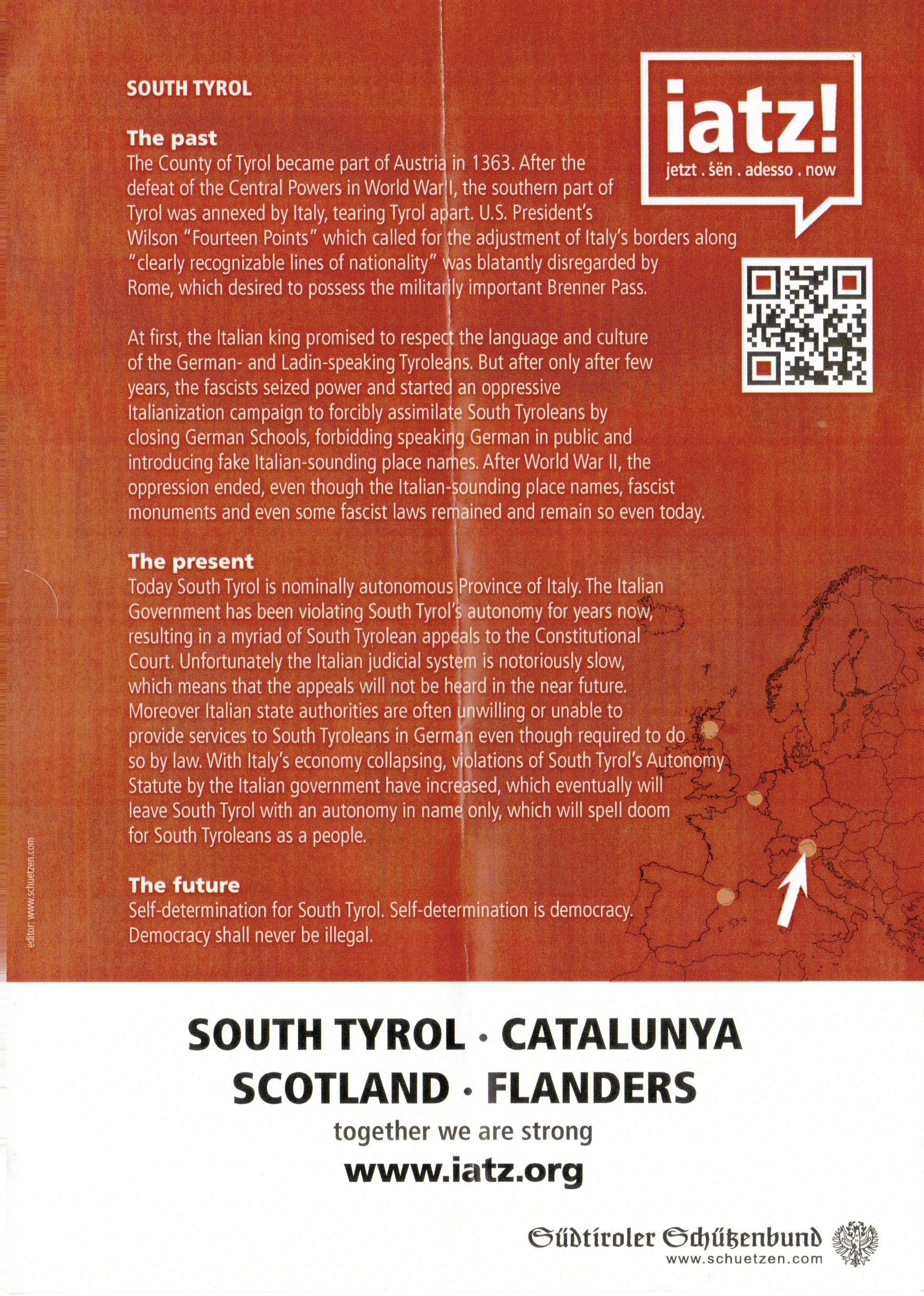 - Firstly, people from other independence movements. I first noticed folk in Lederhosen carrying red and white flags – did they want independence from Austria? Er, no. It turns out that they wish South Tyrol to cease being part of Italy. What should happen next is unclear. Options include