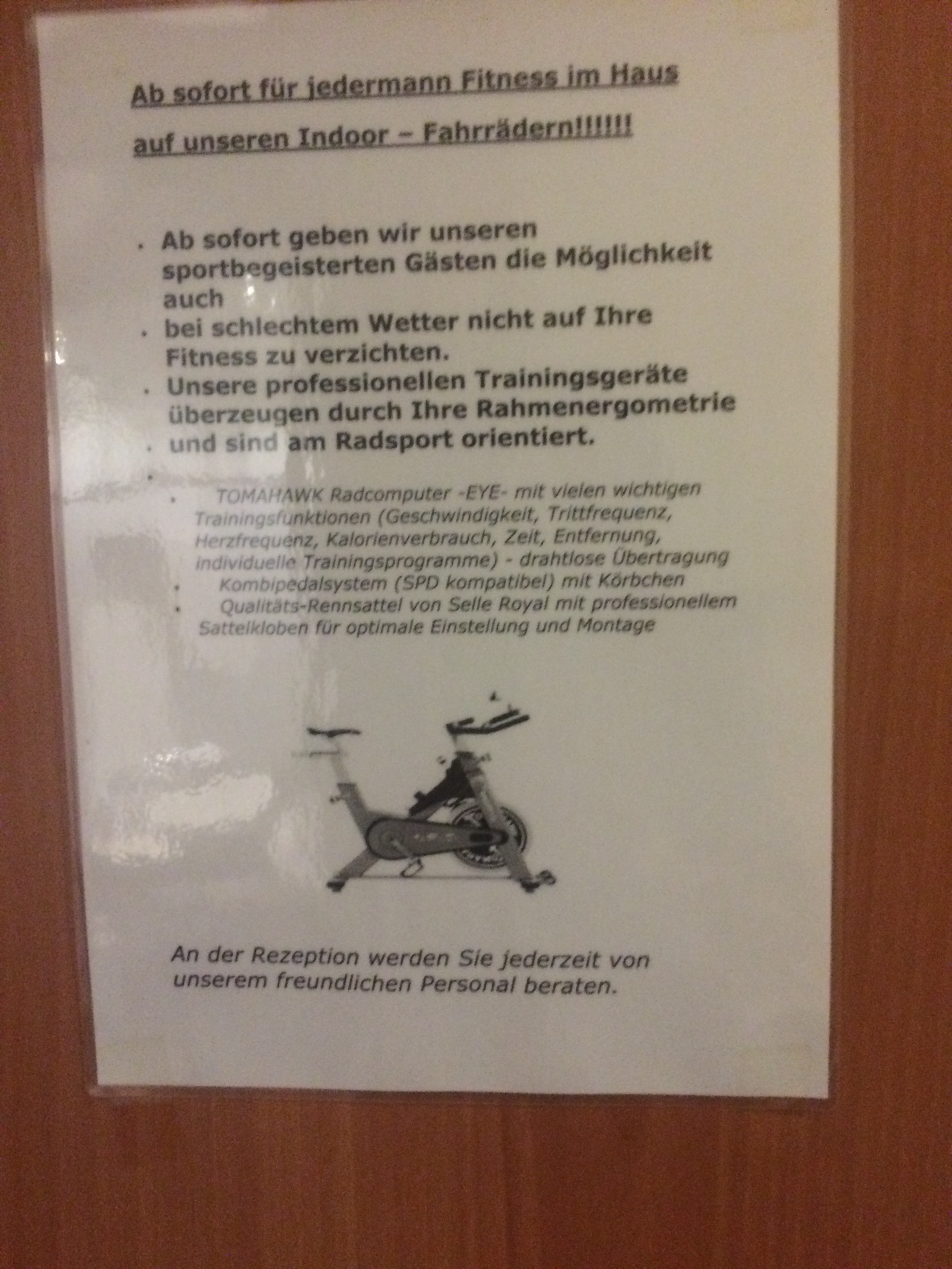 There was a minibar in our room, so I was able to sink a Bitburger before I’d removed my manky lycra. It didn’t touch the sides! Now showered (yes, it happens) and wearing shorts and t-shirt, I’m sitting with Elly, digesting a fried-potato starter. I’m quite spaced and my backside are gently rotating their swonnicles. It’s been a good day – I know this because we’ve both been singing. In my case, it was Exercising some control*, which shows I’m enjoying myself!