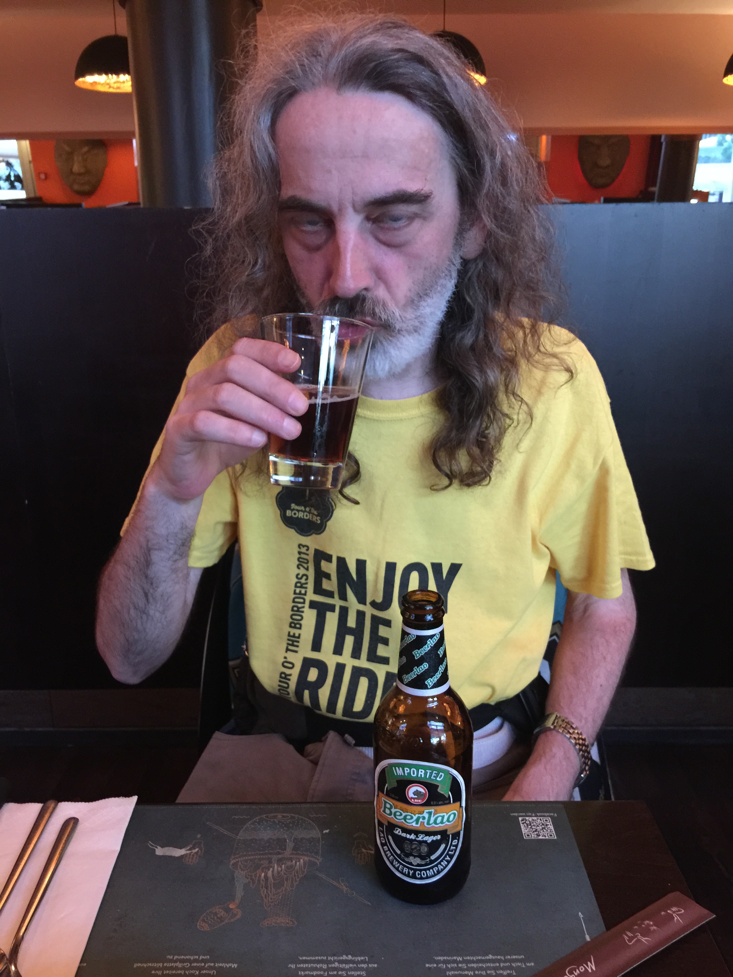 Some frantic fumblings through mail folders on my iPhone (mail folders on iDevices have the worst UI ever) found the relevant email, and the workshop promised to have Lev fitted up within an hour. To pass the time, we nosed at accessories, clothing and food. Elly bought a new rain-jacket (her current one is dying) and some extremely padded fingerless mitts, while I bought a bell for Lev (a must-have in the places we’ve cycled through this trip) and a wee double-sided carrier to mount on the front of Lev’s crossbar. (The workshop also mounted the USB-werk on the front of the crossbar but the carrier fits over it quite nicely.) I considered buying a handlebar mount for iPad minis but sanity prevailed – for the moment. Eventually I will need to see bigger sections of maps as I cycle – zooming a map on a small screen isn’t a precise art.
