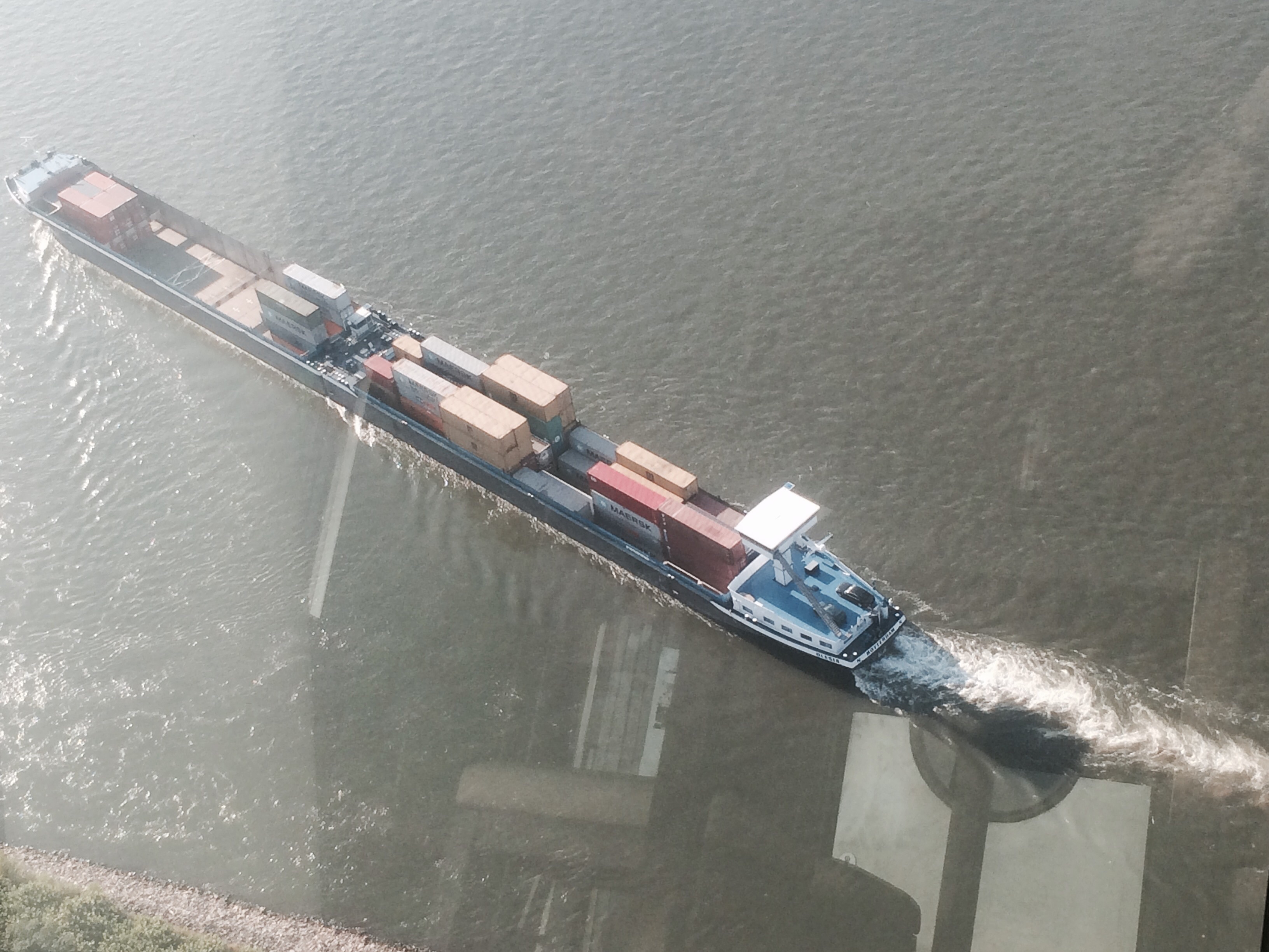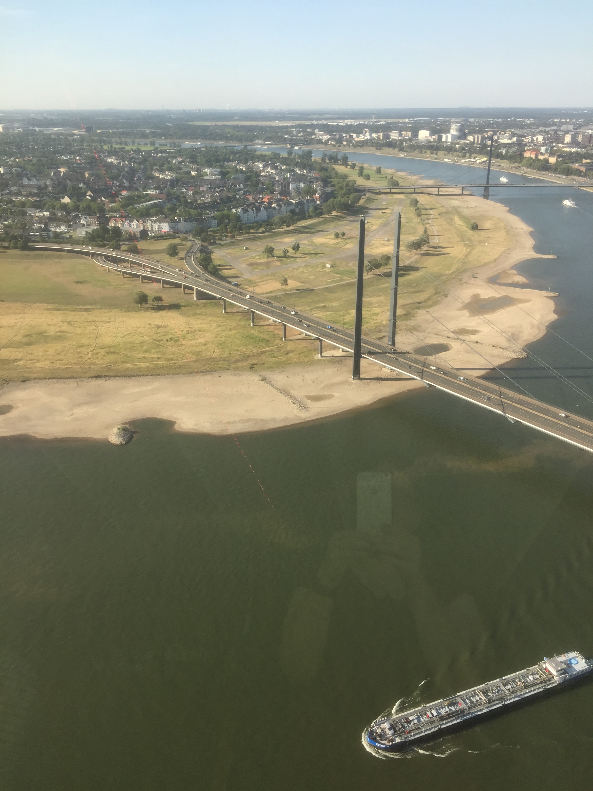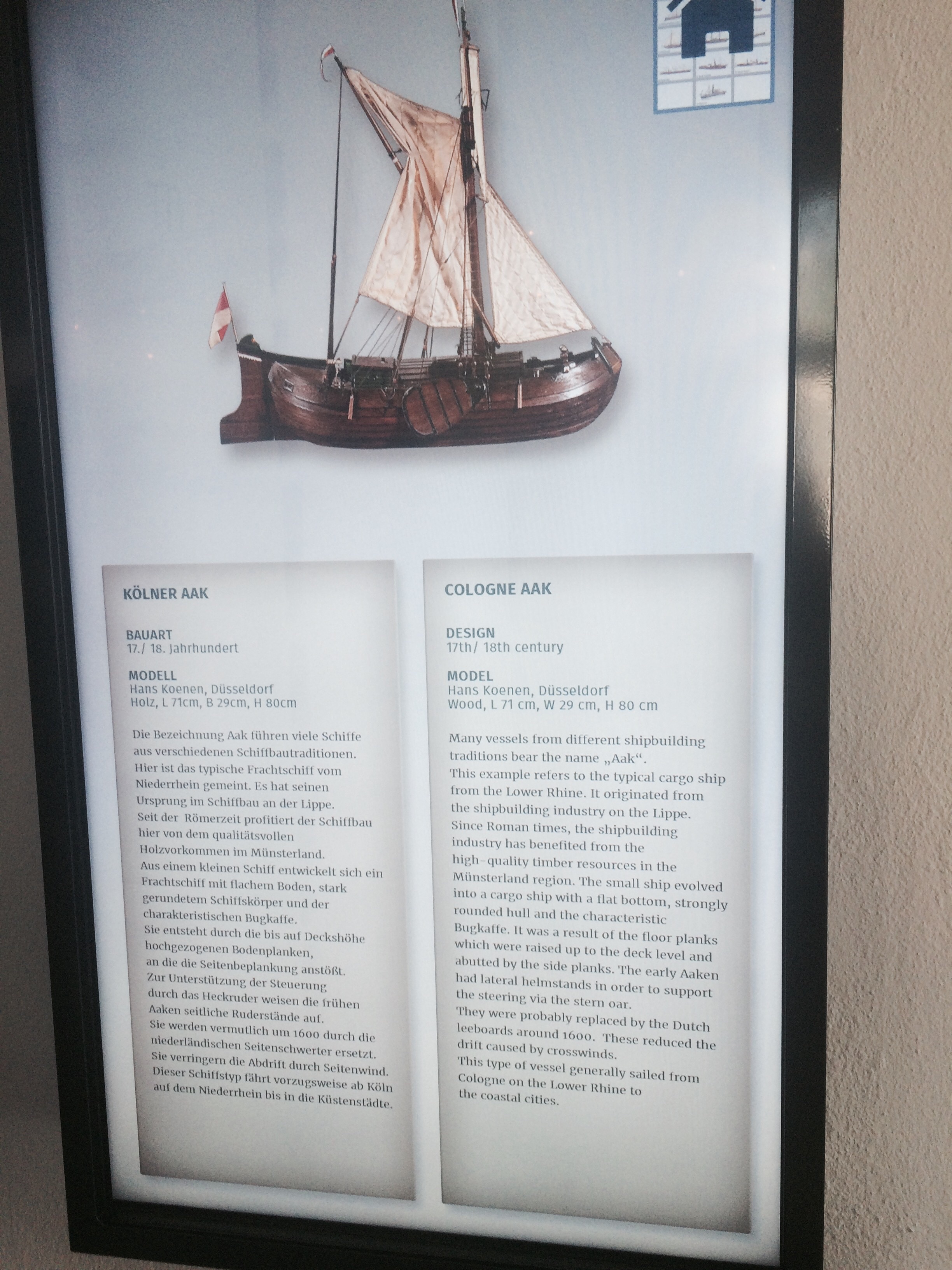 It was stinking hot as we arrived here in Düsseldorf and threaded our way through Düsseldorfers and tourists along the Rhein promenade to near the city centre, then picked our way along inner-city roads to Hotel Hillesheim. We got here about 3pm, and were able to move to the shade of trees along Königsallee for a picknic lunch. We then meandered to the Schiff-farht Museum to learn all about the sorts of boats that inhabit the Rhein, the cultures that accompanied this, how the local princelings taxed goods coming through their stretches of the river usw. Possibly the best part was a video-game trying to steer a virtual barge around a meander. Elly ran out of time just before she docked hers but I crashed.