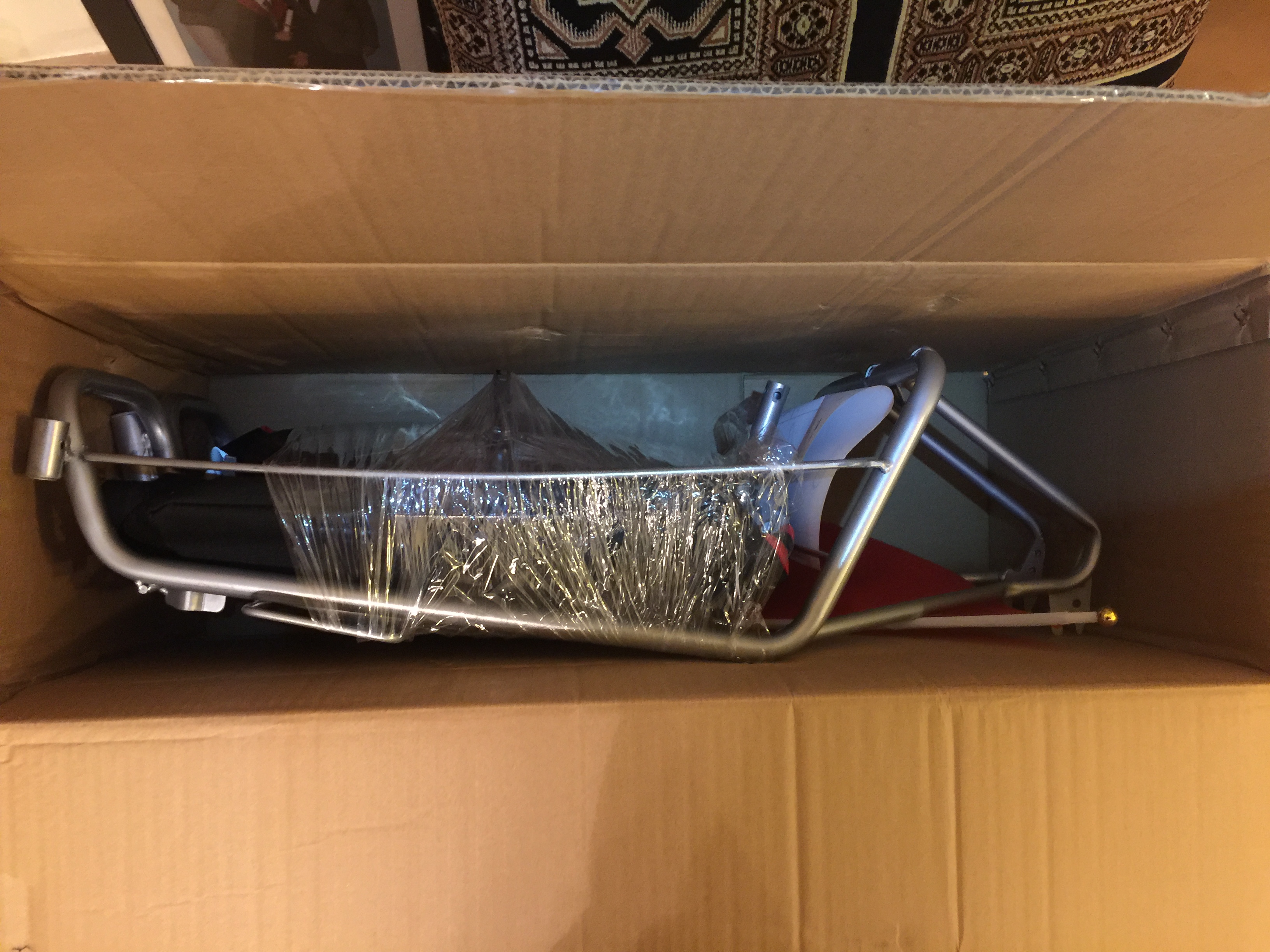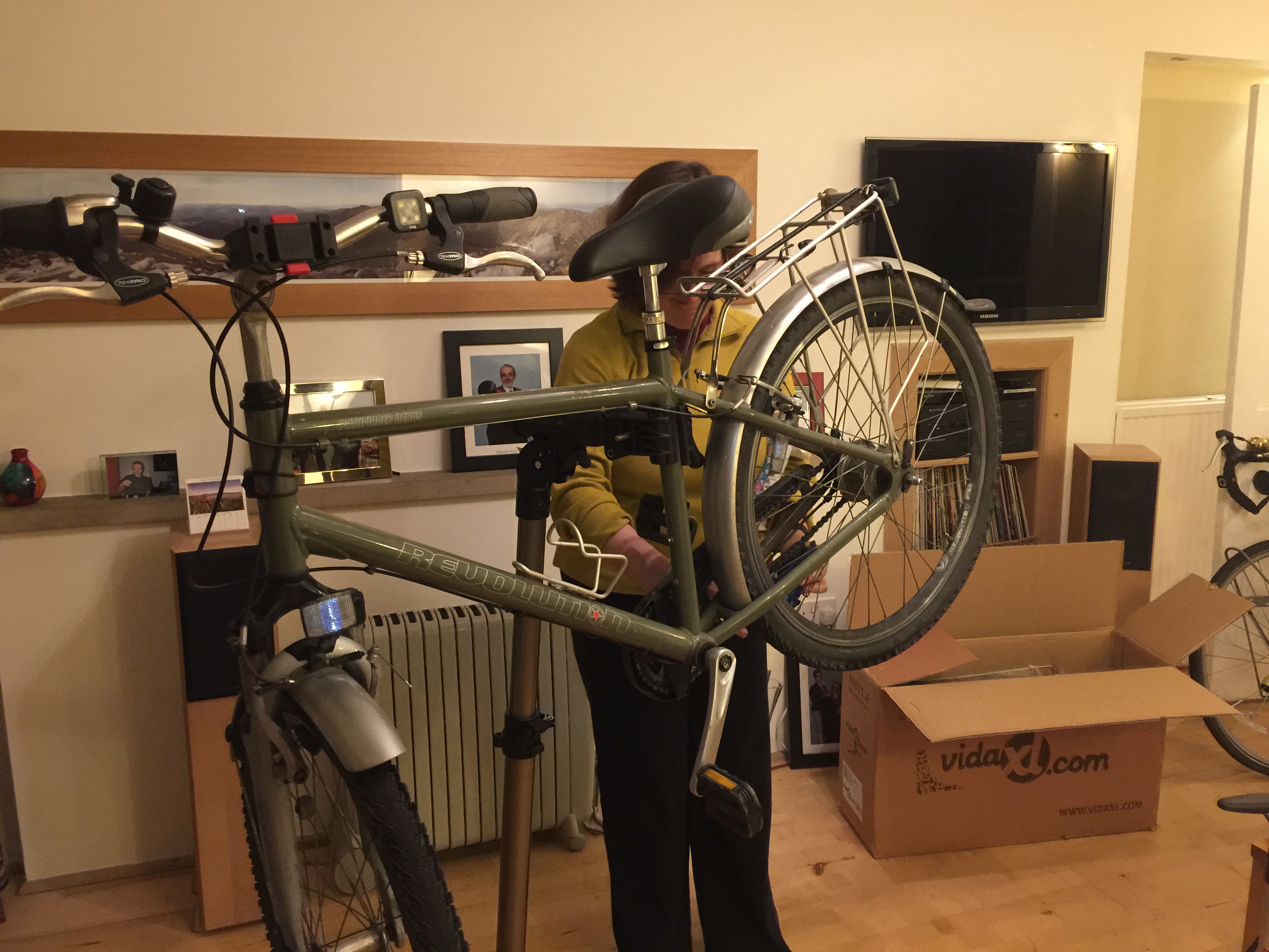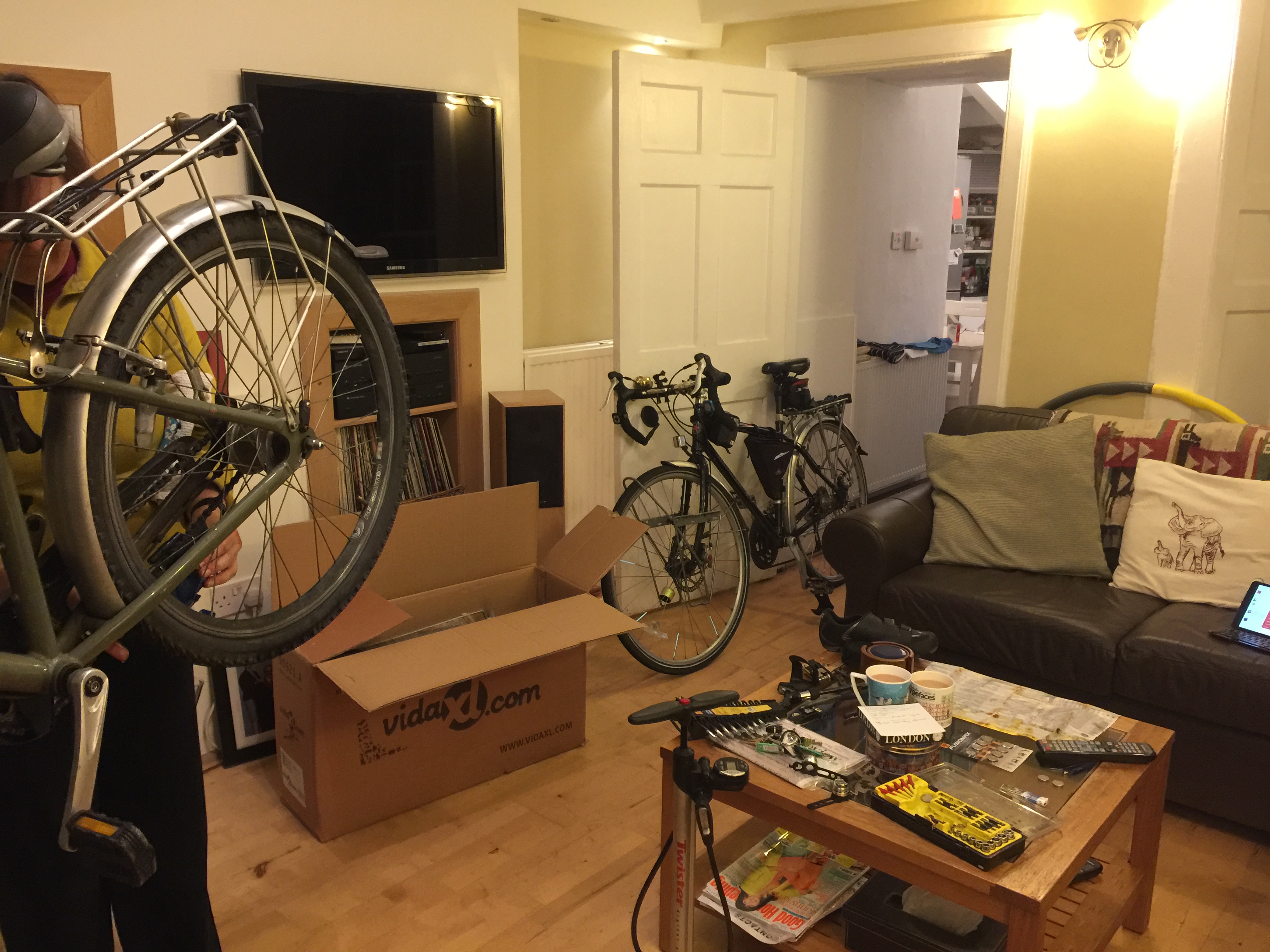 Elly’s comfort-bike, Ché, was returned to her on Friday. Che had been languishing in a friend’s garage – her friend hadn’t enjoyed cycling in Edinburgh. He was sore in need of basic TLC: cleaning, oiling, adjusting brakes and inflating tyres. So Elly got to work on him while I unboxed and assembled my trailer.