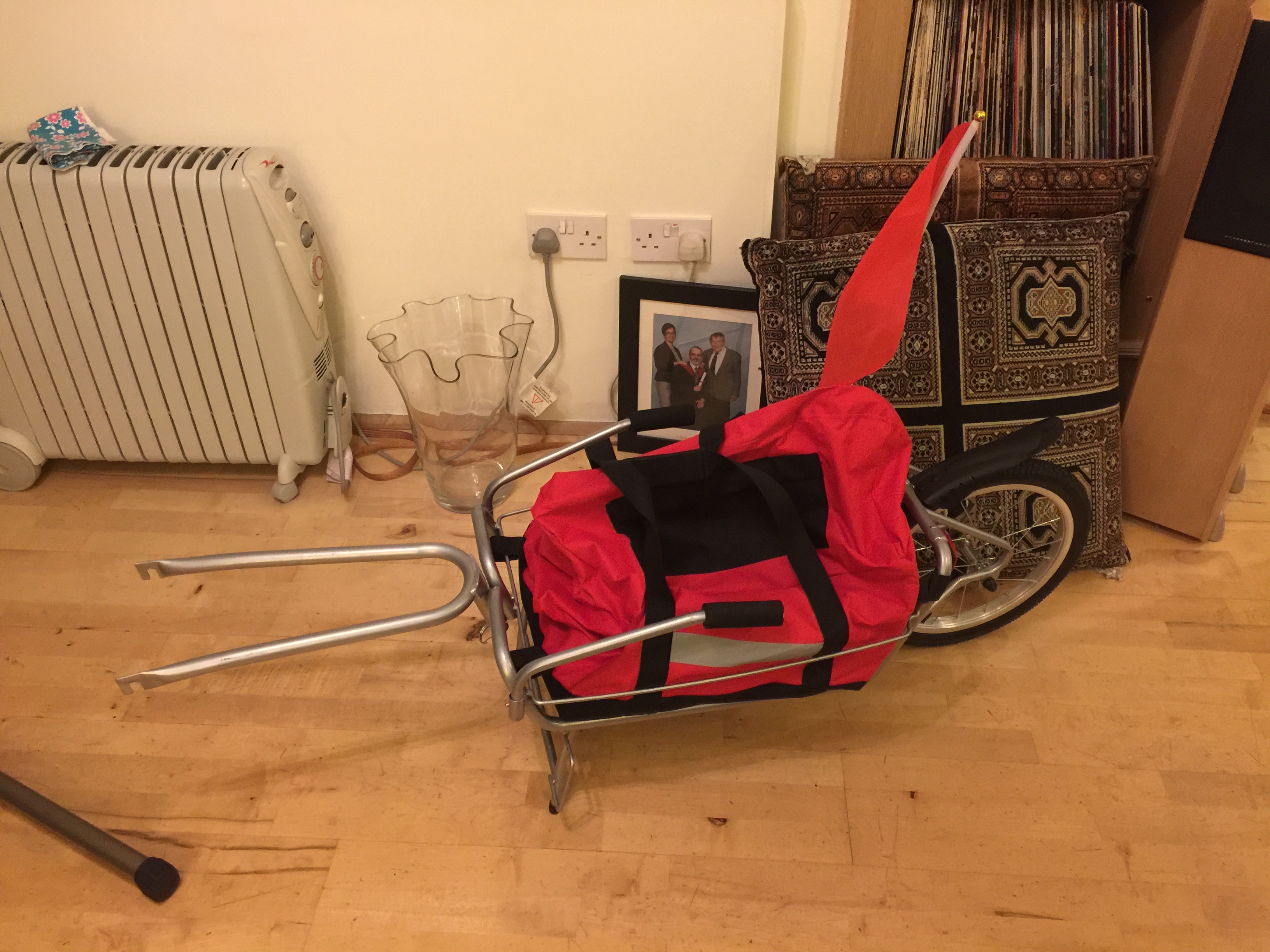 By the time I’d finished this, it was too late to go and try the trailer on the road, so that waited until this morning. It took about 5 minutes to reattach the trailer to the extra bolts, then I headed off around local streets (cyclemeter map) to learn how pulling the unladen trailer felt. It was OK. I knew I had a payload, and so Lev didn’t feel at all nippy. But the trailer didn’t hamper turns or balancing, and wasn’t blown over by today’s stupidly gusting winds. However, after 20 minutes I’d had enough of being rained on and blown all around the road. I’ll try towing the trailer to Napier tomorrow – Lothian Road and Bruntsfield Place should be all sorts of fun!