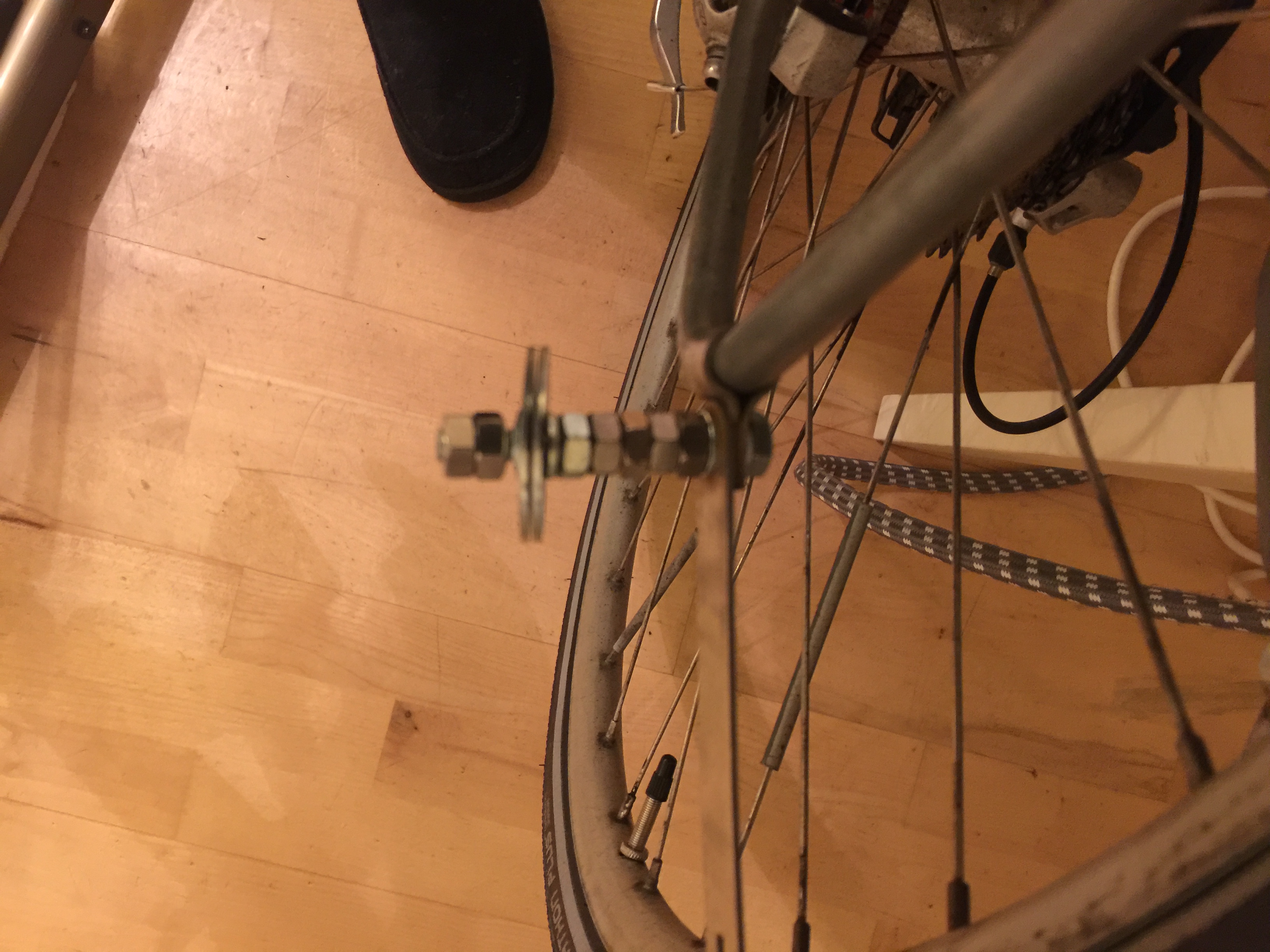 Secondly, it’s cheap aluminium. I don’t trust it to last. Thirdly, whenever I’ve removed Lev’s wheels, it’s taken ages to replace them – it’s very fiddly getting the brake-disks precisely into their slots. I don’t want to lose 20 minutes each day to that shenanigans.