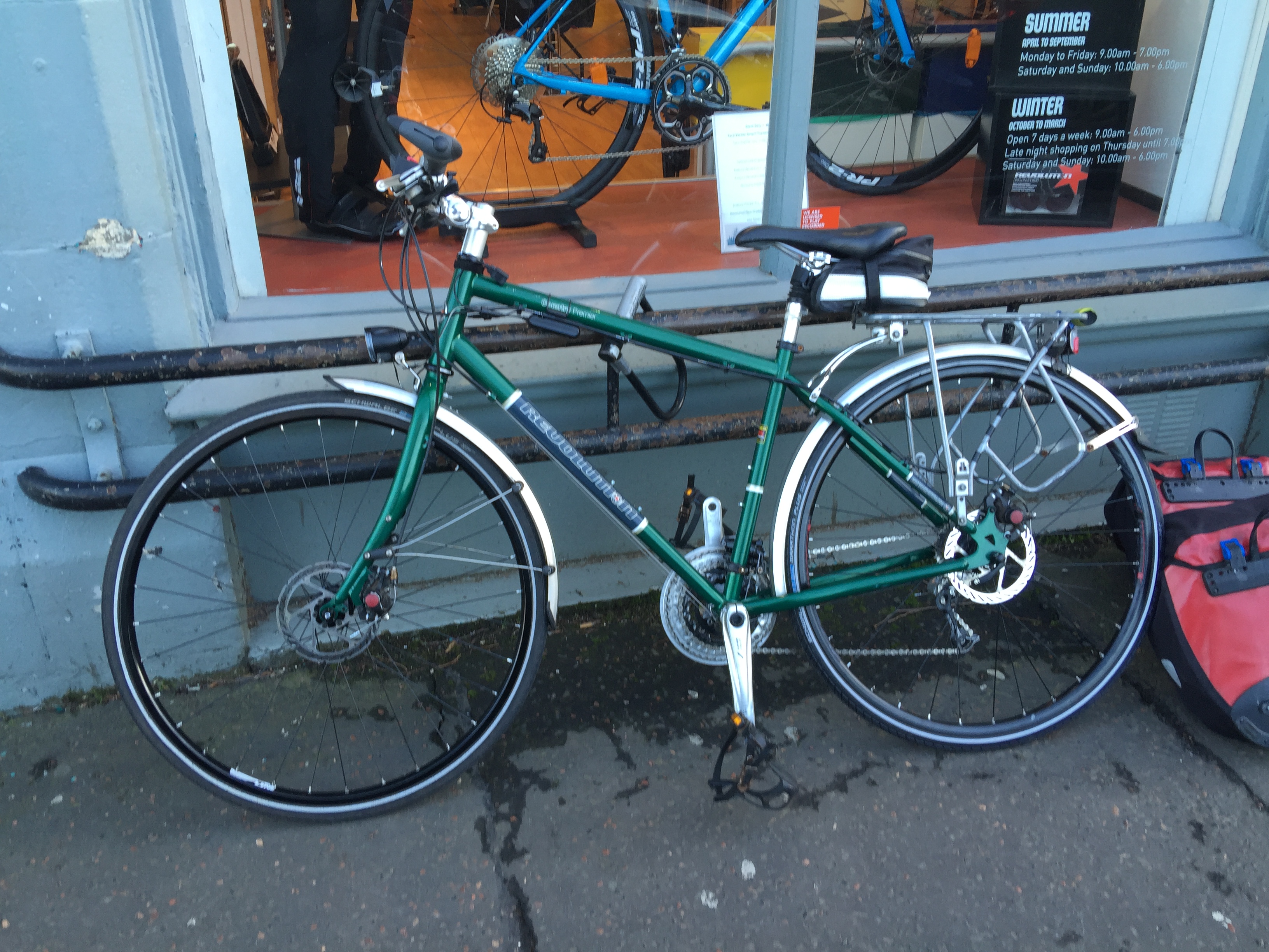 A final note of thanks to Edinburgh Bicycle Co-op for not selling me a set of replacement mudguards, instead pointing out that I can cut off the hanging flap of mudguard below the break, then re-affix the stays myself. They didn’t want to take money that they felt I didn’t need to spend. I’m now about to find out whether they are right!