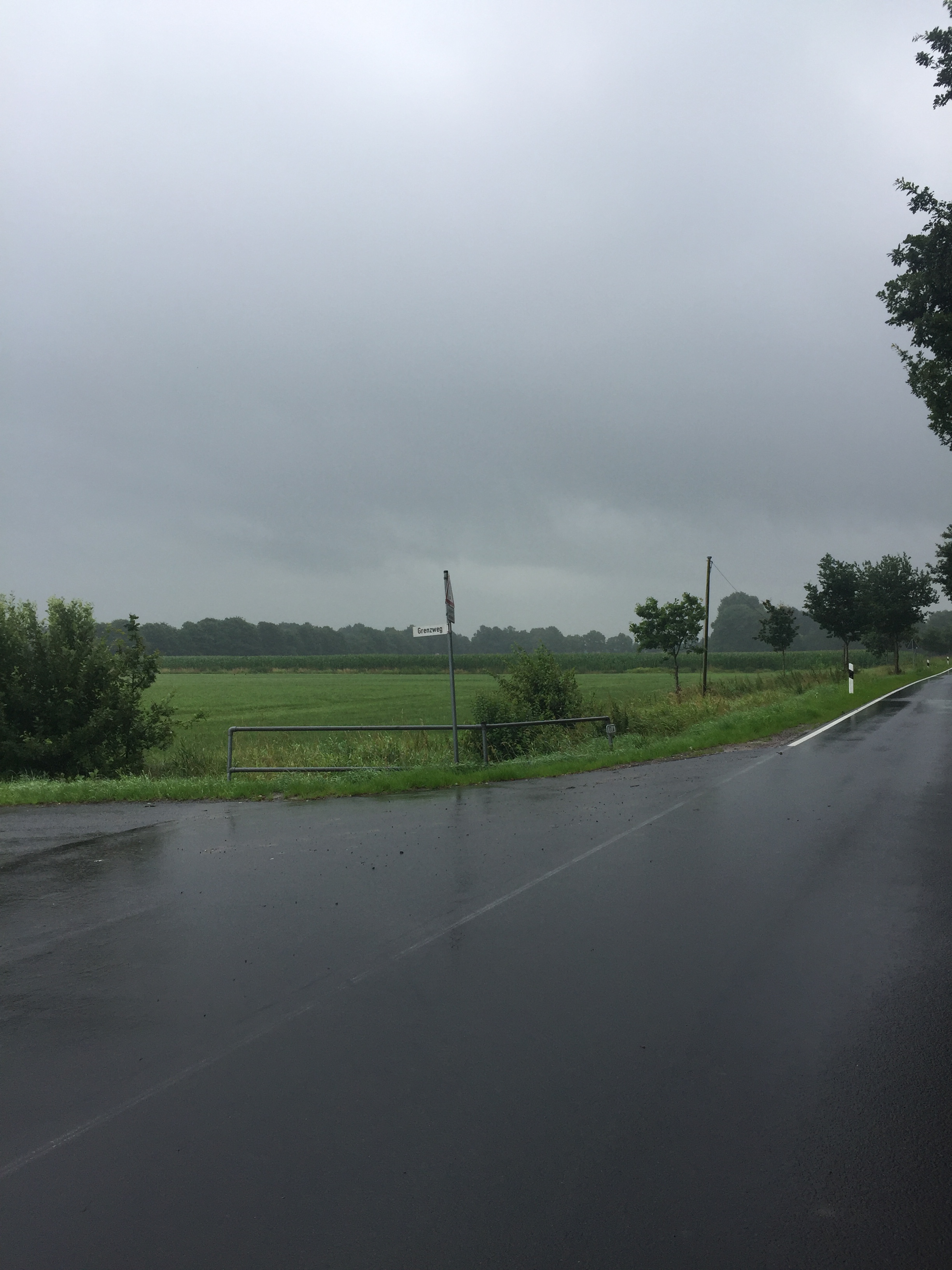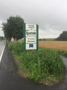So we changed plan, and headed for the nearest station that had regular trains to Bremen. This was Leer, 24 miles from Winschoten. (We also stopped at the station in Bunde (Wikipedia) but it didn’t offer us any useful connections.) It took us 2 hours 40 minutes to dribble 28 miles. Stop time includes visiting an Aldi just outside Leer for supplies (including much-wanted chocolate), because we were only going to Germany’s 11th most populous city (Wikipedia), where there would t be any supermarkets at all! This stop had enough shelter to make fishing for waterproofs in panniers a non-pyrrhic activity, by now it had stopped raining. The wind had died down too, so waterproofs would have just caused overheating. We did make our first cycled border-crossing:
