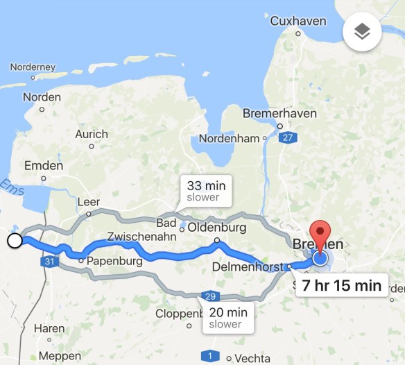 Last night we had fantasies of cycling 87 miles from Winschoten to Bremen, or maybe just 60 miles to Oldenburg, with coffee-stops at Papenburg (21 miles) and Bad Zwischenahn (34 miles).