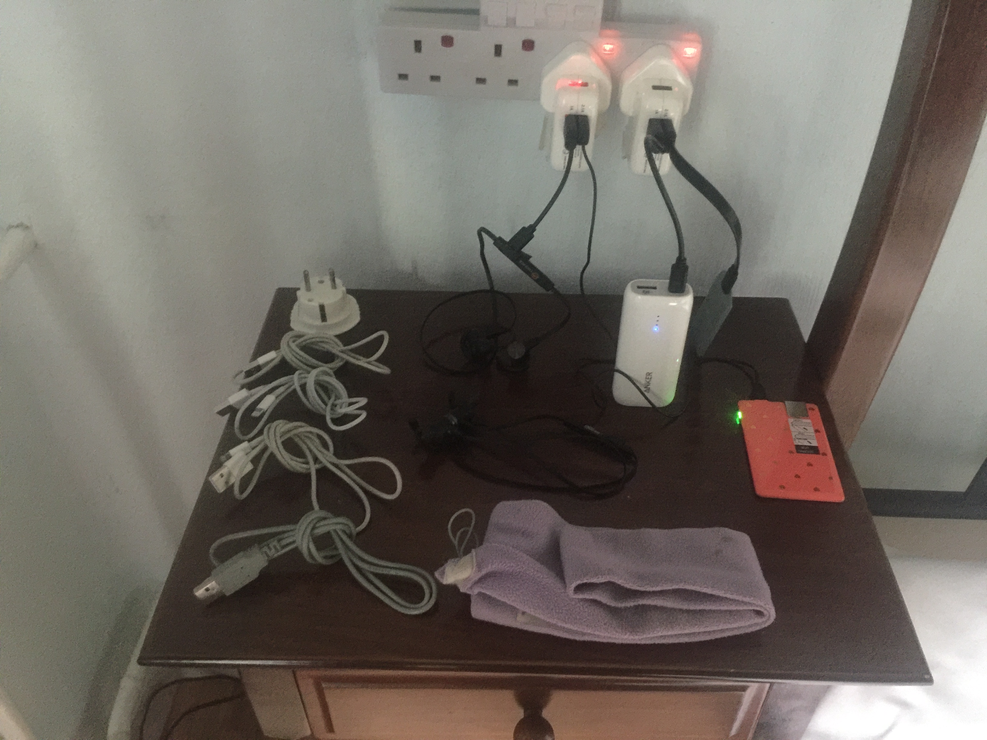 I’ve brought too much electronica. From the back left of the table-top, going anti-clockwise: spare continental adaptor,3 lightning cables, 1 micro-USB cables, sleep-phones, small USB battery plus micro-USB cable, spare sleep-phones battery plus micro-USB cable, large USB battery plus micro-USB cable, 2 pairs of Bluetooth headsets plus micro-USB cable. Also pictured: 4-way UK plug adaptor (plus hidden continental adaptor), 2 two-port USB plugs. Not pictured: GoPro kit, 2 jPhones plus their handlebar mounts.