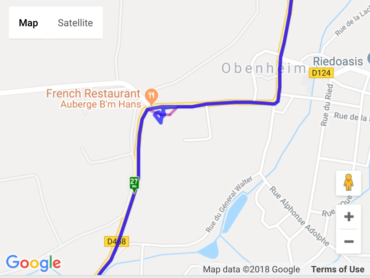 OK, enough moaning! I’m getting very fond of Alsace. There is an enjoyable mix of German and French cultures and languages. I’ve already mentioned Germanic place-names and eating pretzels in France. At an impromptu drinks-stop in Obenheim, the proprietress spoke with us only in German. But Google Maps, that fountain of truth, says it’s a ‘French restaurant: Auberge B’m Hans’!