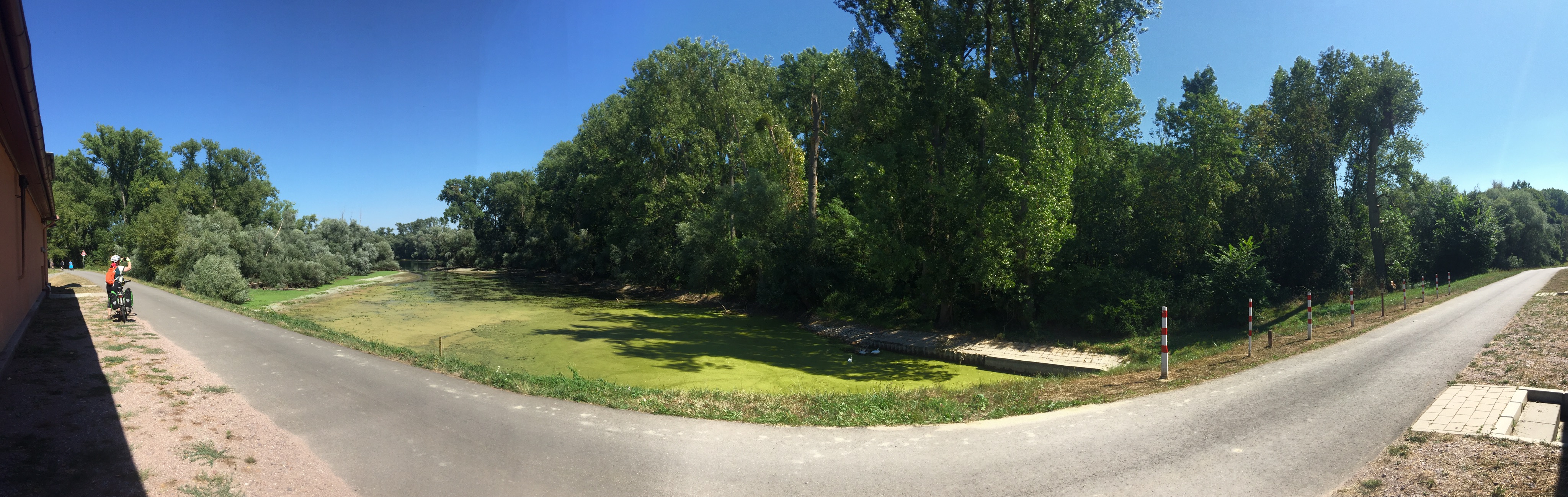 After that, the the ‘official’ route (the signposted EV15 route, the guidebook EV15 route and the EV15 app all disagree with each other from time to time) took us due north along a very straight forest route (with a couple of stops for saddle-adjustment and foot-anaesthesia) to Eggenstein-Leopoldshafen where we meandered through a housing estate. (I blame the lack of signs – my navigation is always perfect, of course.)