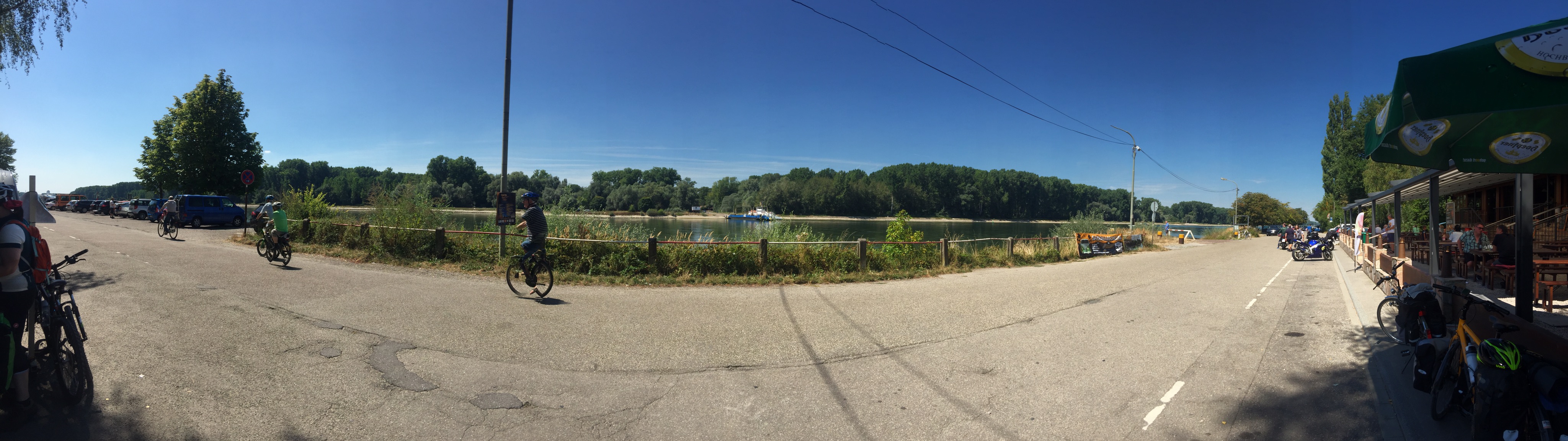 A diversion a few minutes later had us circling around an industrial estate, looking for a way forward. Slightly further, I managed to temporarily lose Elly when a hedge separated a road-route across a bridge from the cycle-path. However, we found each other fairly soon and pushed on to the ferry across the Rhine between Rheinblick-Leopoldshafen and Leimersheim. (Cyclemeter is inaccurate here because my phone got too hot.)
