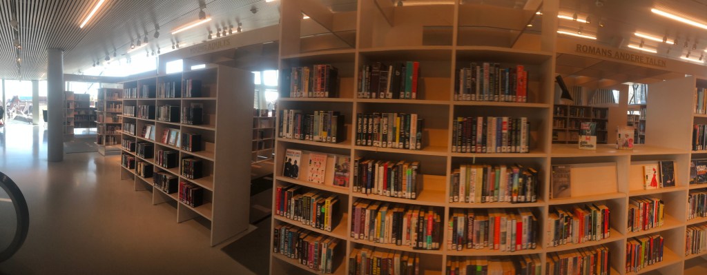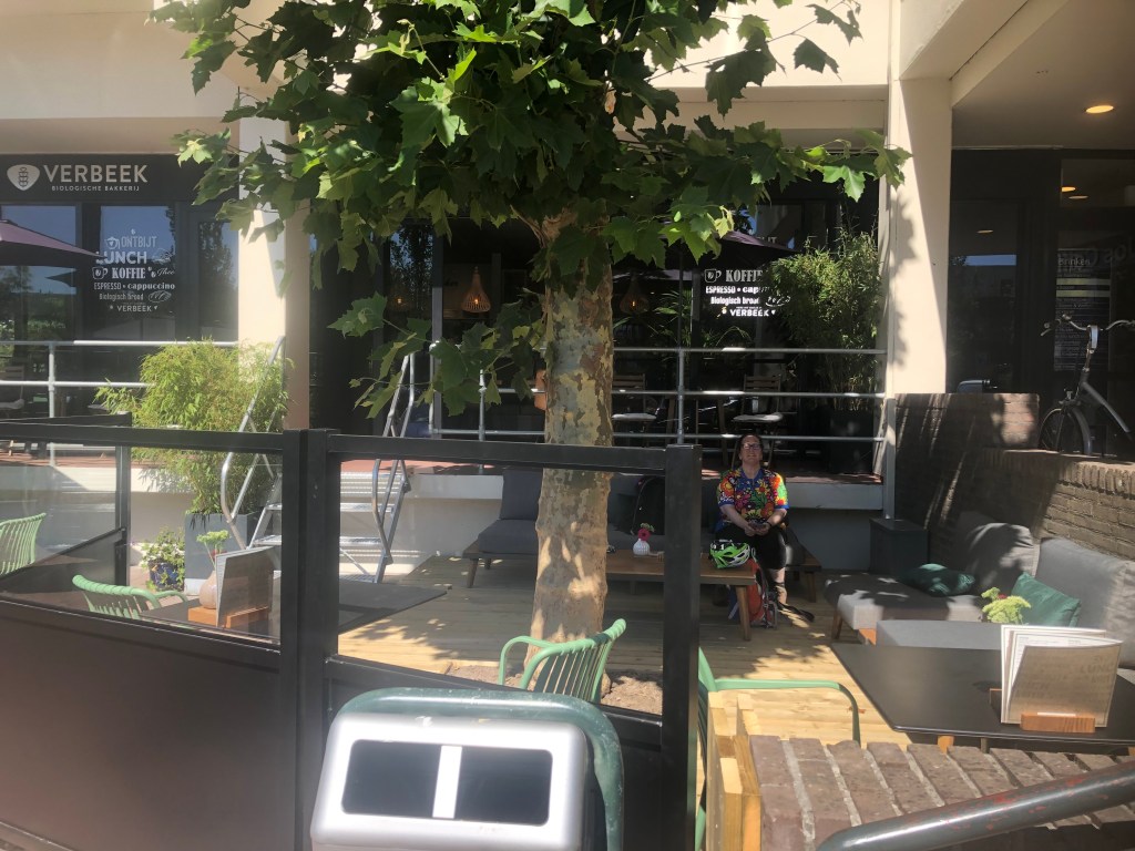 I think we (and Drenthe and Groningen) got today right: about 10km to Vries, drinks at Onter den Linden, another 13 km to Haren, bean salad and cheese toasties and cake (there was a CHOICE of vegan cakes) at Verbeek and then a few km on to Groningen. The only issues were the my water rucksack’ hose detached itself from the bladder, causing moistness in interesting places, and the sun being so bright that at times I couldn’t see my phone to navigate. A little shopping was the first stop: I bought a new bladder for my water-rucksack, and Elly bought other essentials. (Ask her!) This afternoon’s trip to Gronigen’s library-cum-everything was a wee highlight. Currently we’re in Handy Wash because our cellphones were minging.