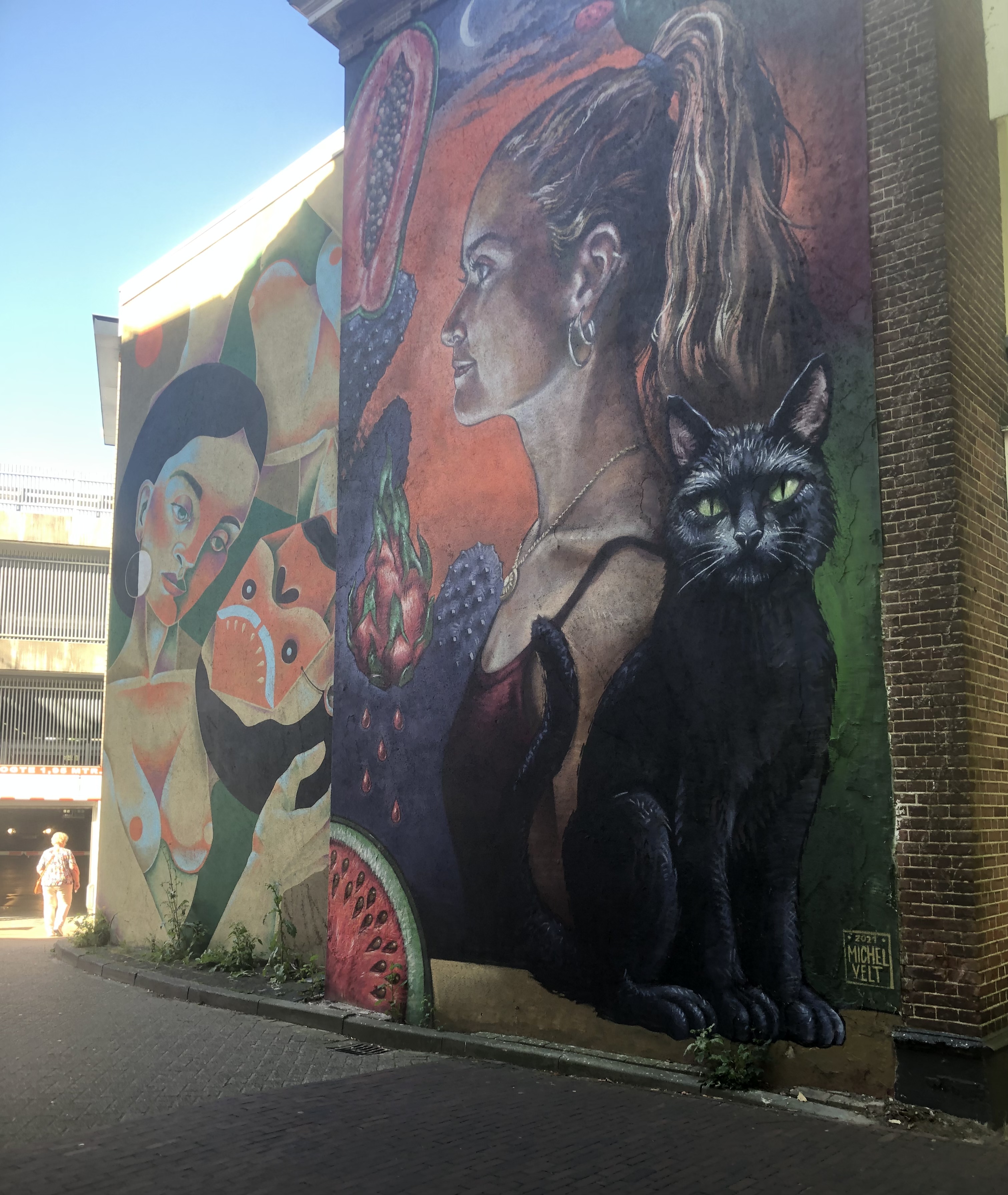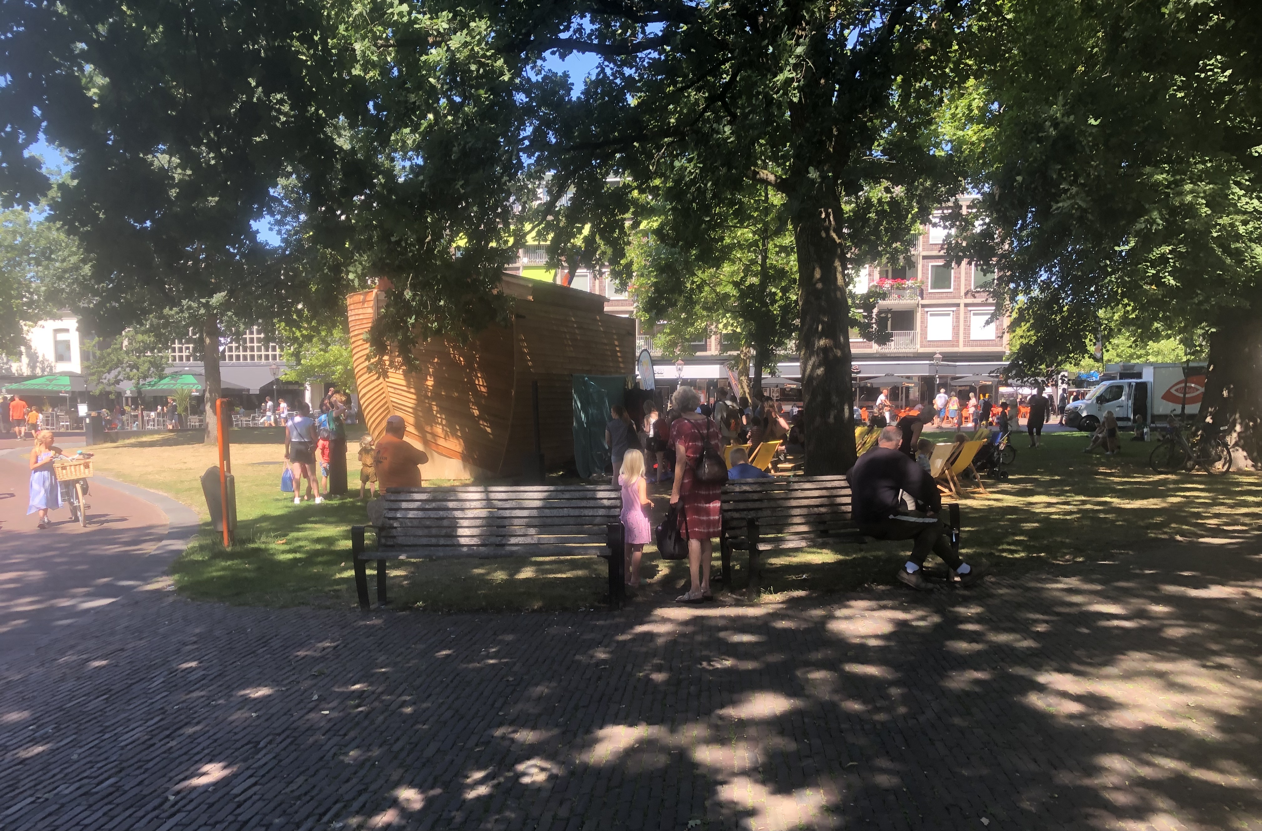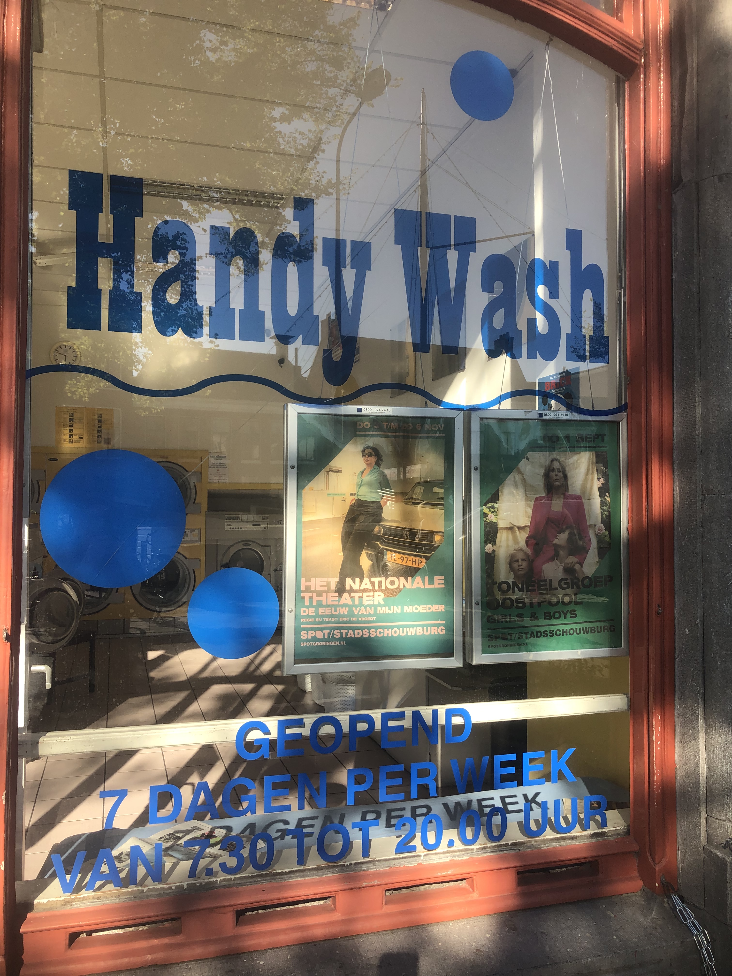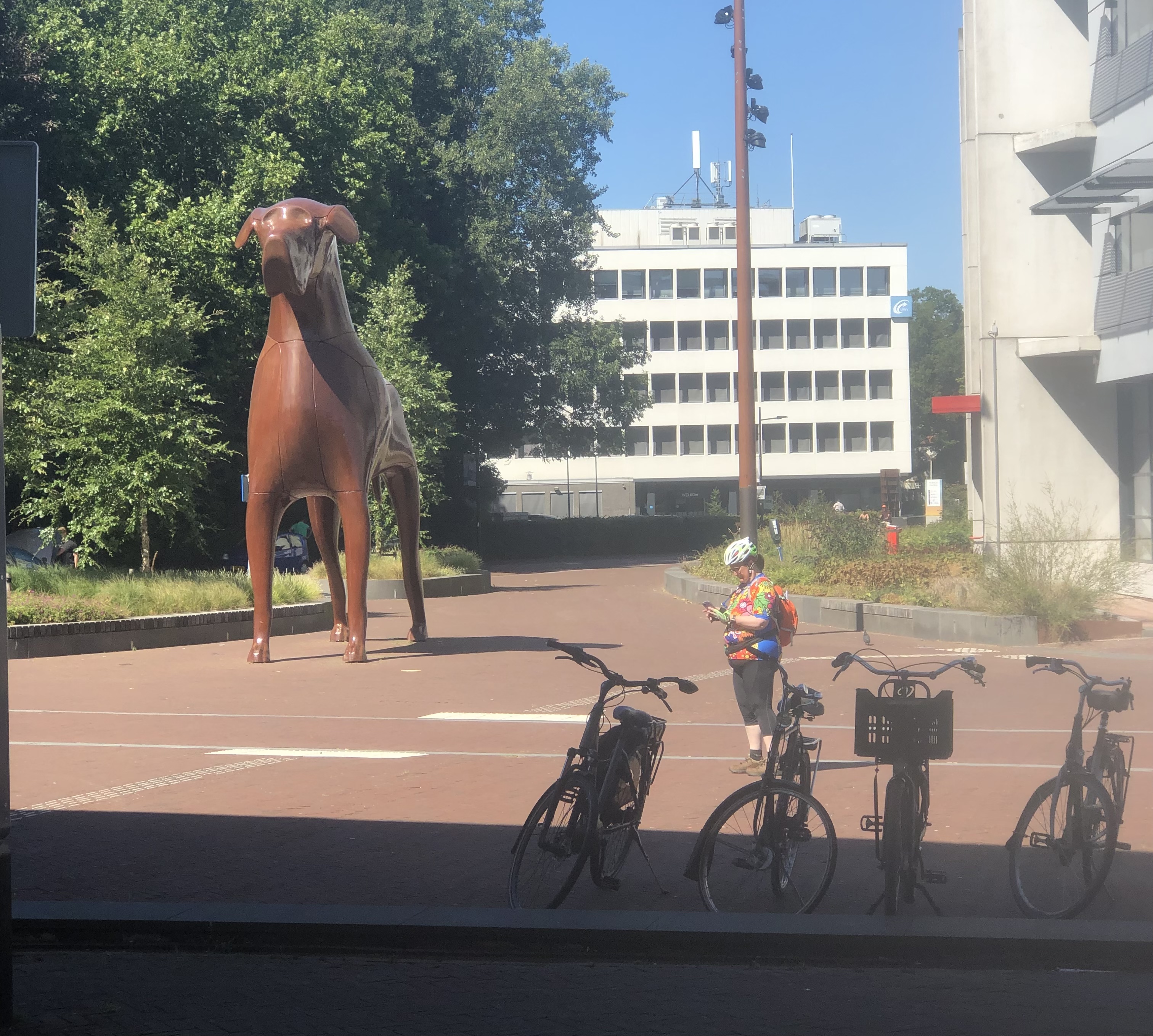 I think we (and Drenthe and Groningen) got today right: about 10km to Vries, drinks at Onter den Linden, another 13 km to Haren, bean salad and cheese toasties and cake (there was a CHOICE of vegan cakes) at Verbeek and then a few km on to Groningen. The only issues were the my water rucksack’ hose detached itself from the bladder, causing moistness in interesting places, and the sun being so bright that at times I couldn’t see my phone to navigate. A little shopping was the first stop: I bought a new bladder for my water-rucksack, and Elly bought other essentials. (Ask her!) This afternoon’s trip to Gronigen’s library-cum-everything was a wee highlight. Currently we’re in Handy Wash because our cellphones were minging.
