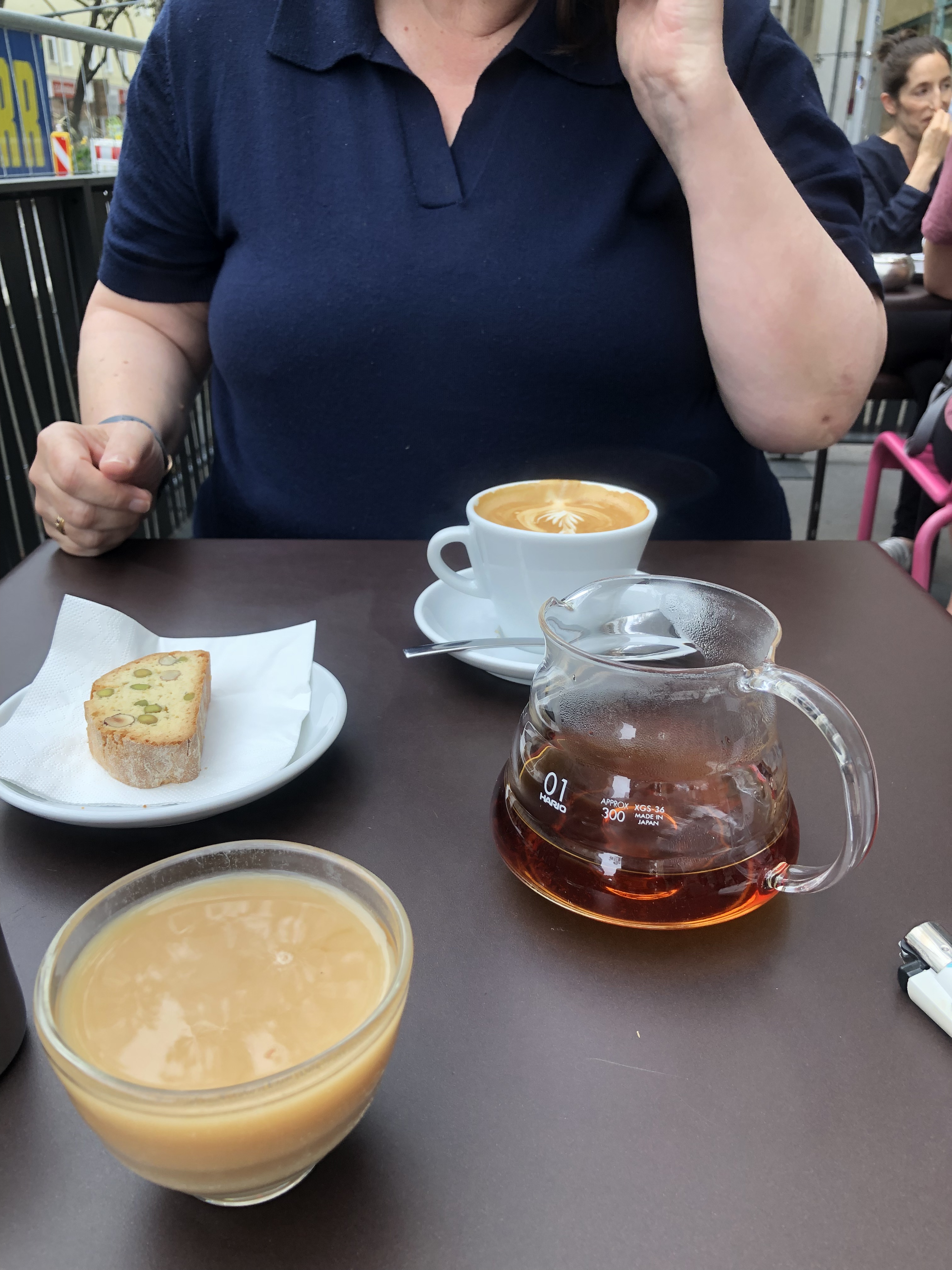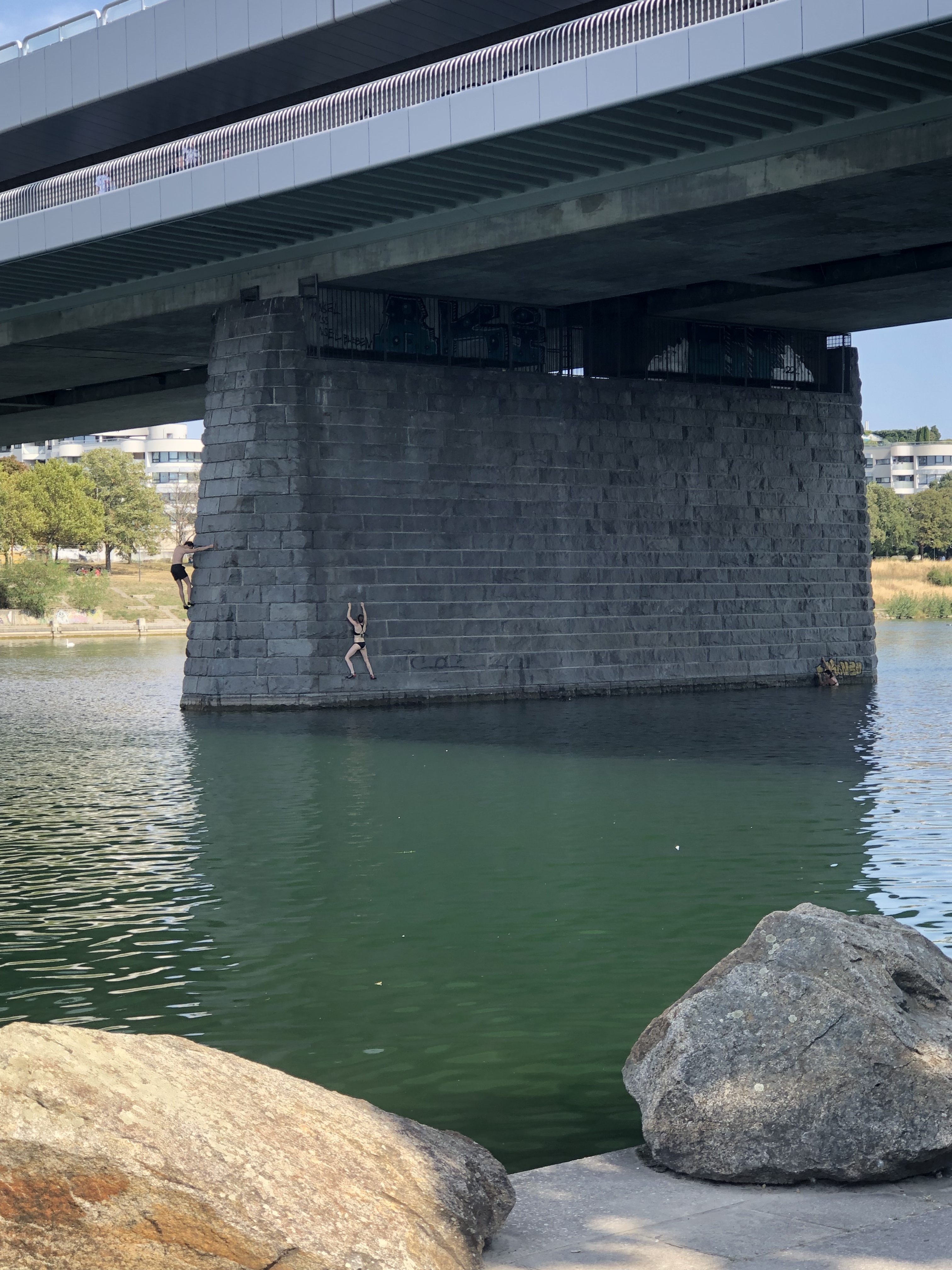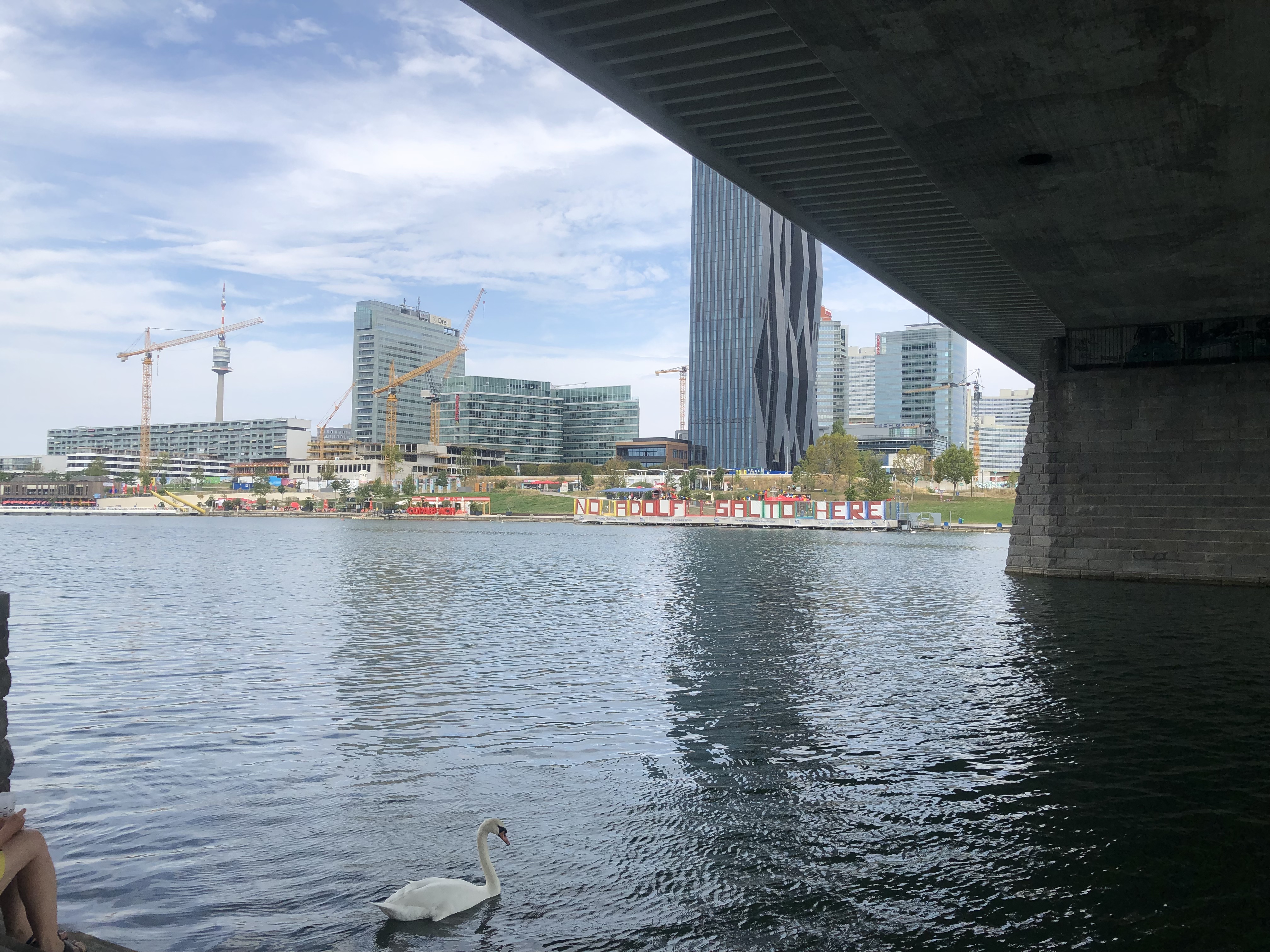 Our first destination was breakfast at Cafe Aida at the other end of Praterstrasse. They now do vegan cakes and coffees, as well as normal stuff. Next was time for a swim in the Danube off Donauinsel, followed by watching other swimmers trying to climb the bridge pillars.