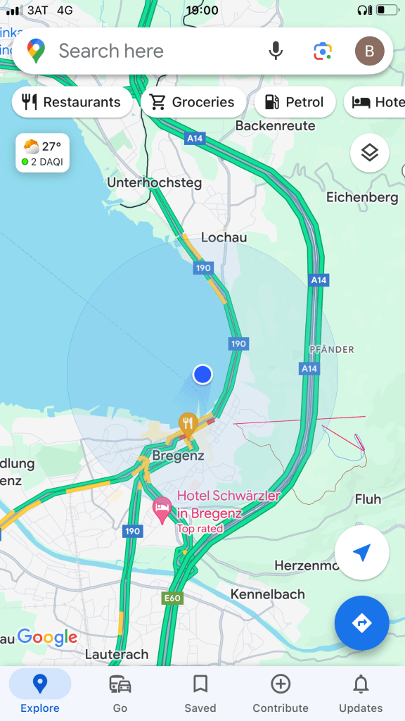 After refreshing nicotine and fluid levels in Memingen, we had a final hour of travel to Bregenz. Unfortunately, cellphone signal was really weak so I couldn’t screenshot exactly when we crossed the border.