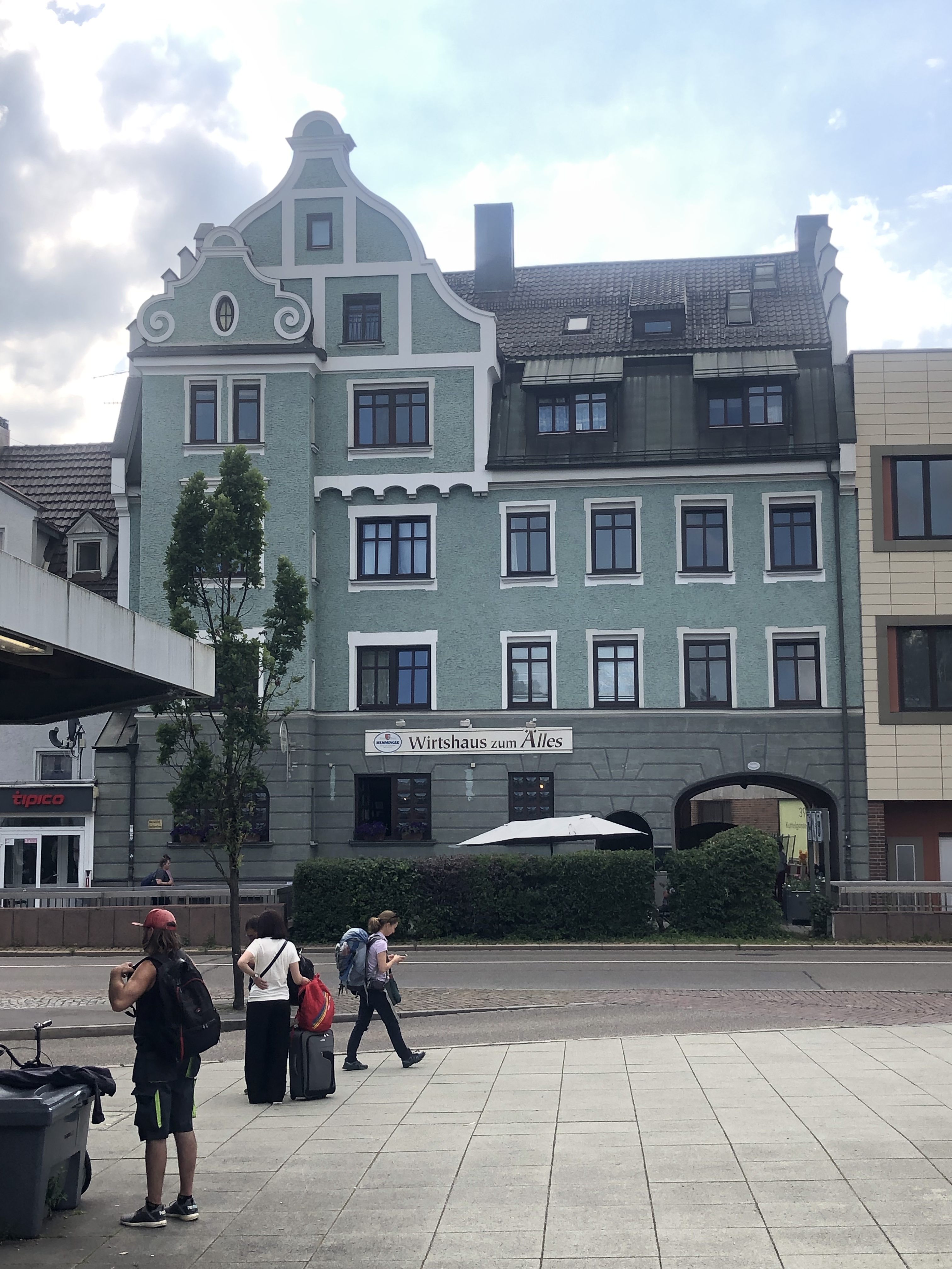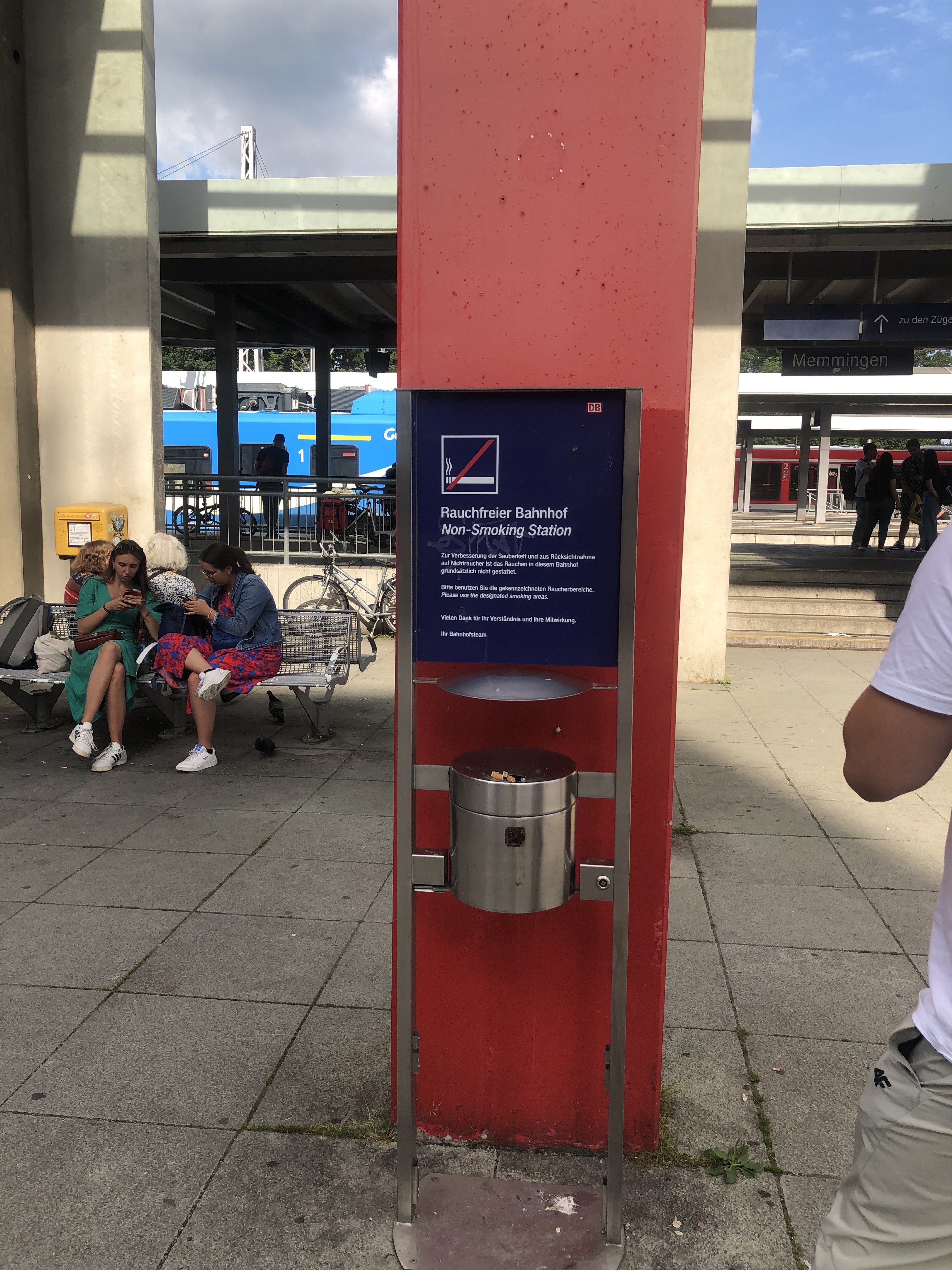 Ok, enough moaning. I loved the scenery along the Rhine, especially as the trainline hugged the gorge between Rheinland-Pfalz and Hesse. I loved all the fun place names. I loved that we were travelling to the Muttiland without flying. I loved that I managed over 6 hours without moaning about my depleted nicotine levels. And I loved that when the train finally stopped in Memmingen, our door was right next to a smoking area on the platform!