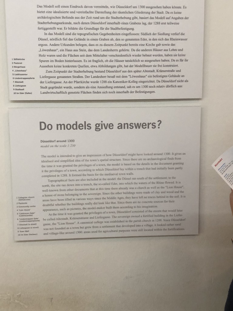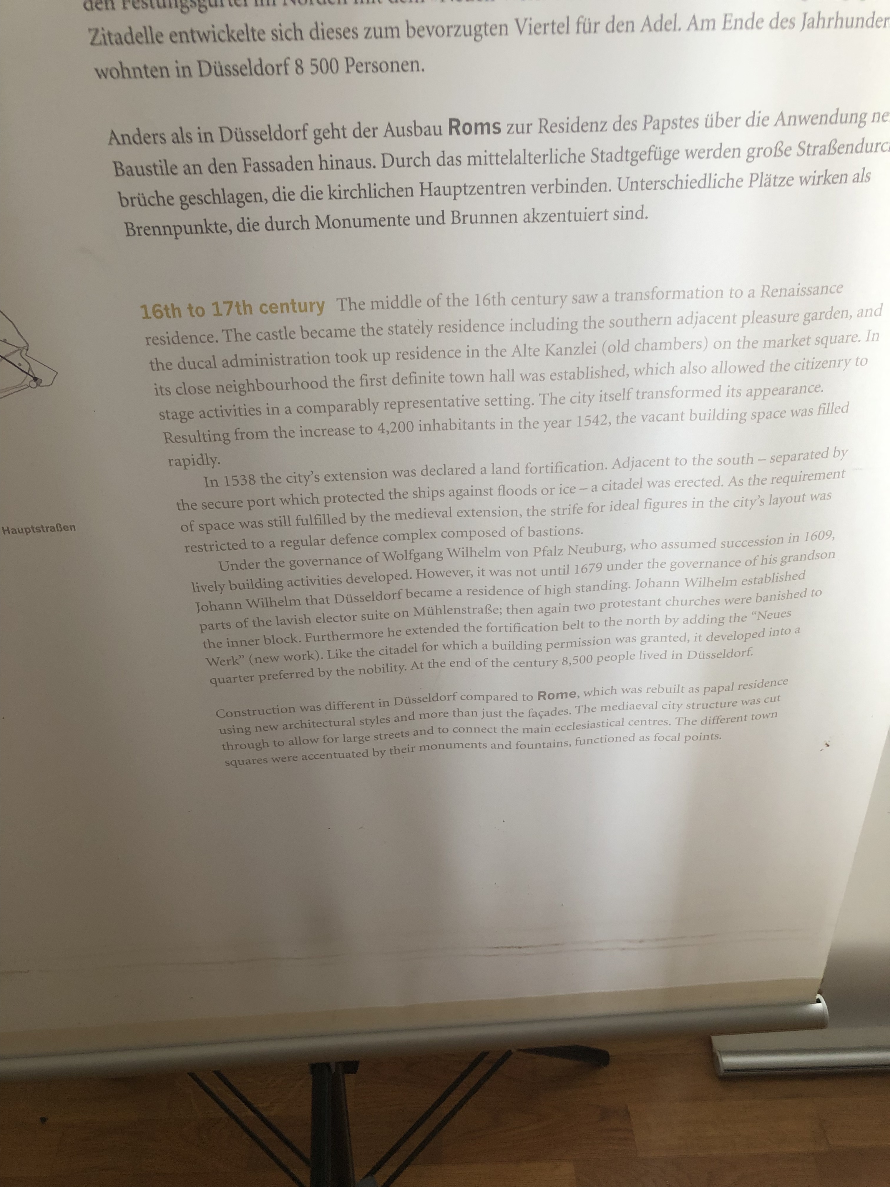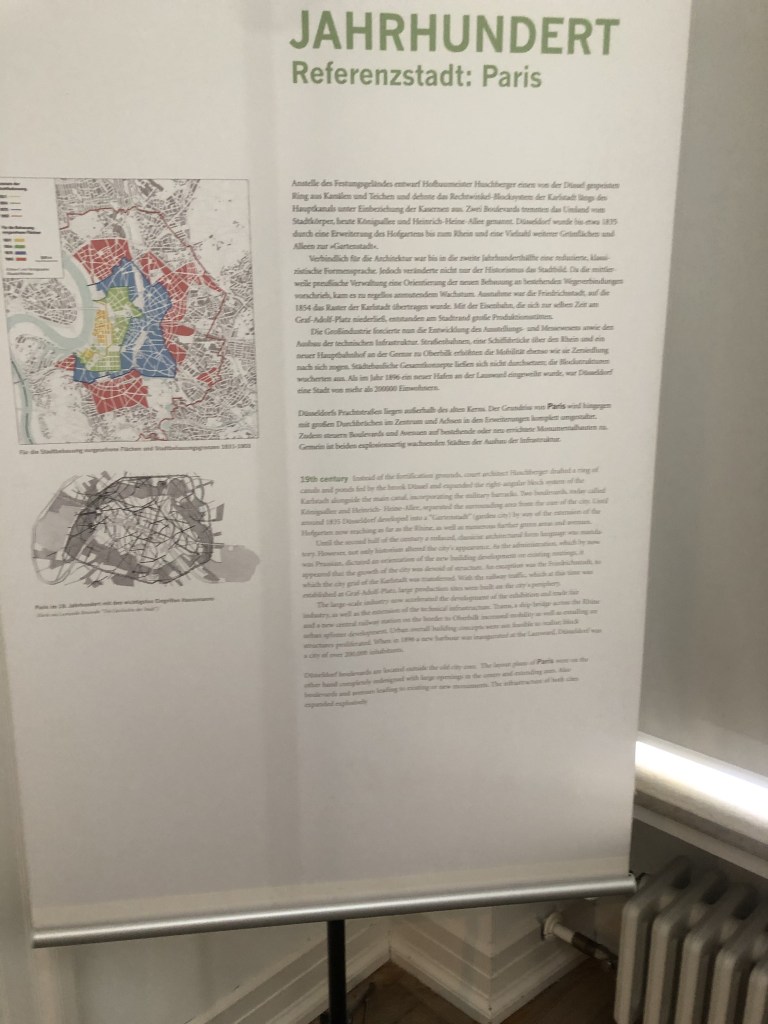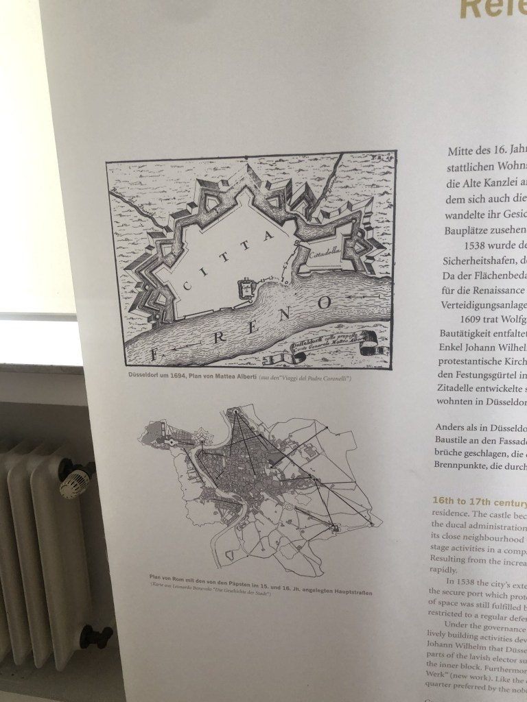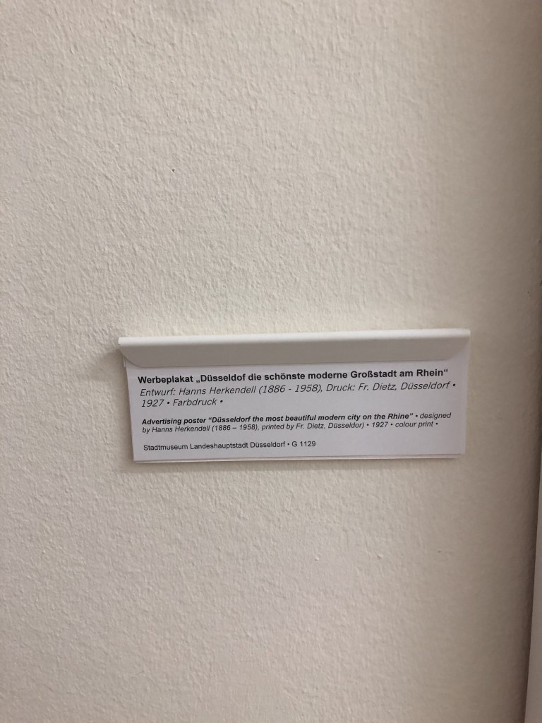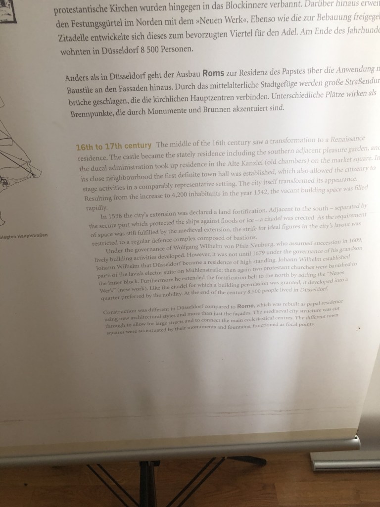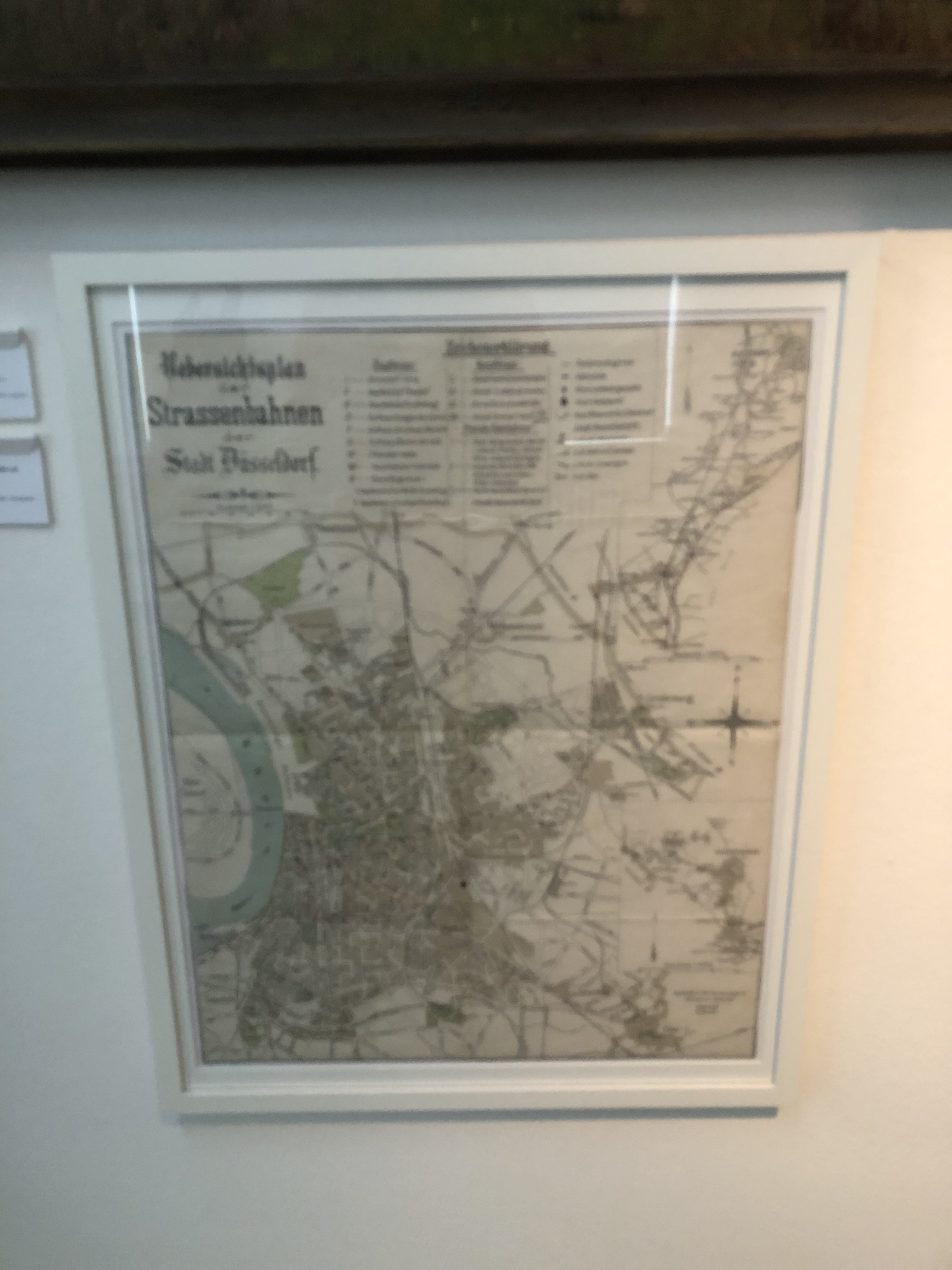 After getting set up in our hotel, and me reassuring someone outside it that a local pigeon hadn’t shat in her hair, we went by tram to the Stadtmuseum. It’s in the part of Düsseldorf that houses the Nordrhein-Westfalen government, and is well worth a visit if you want to understand how the city developed. So here are lots of photos, roughly in the order the history was described, along with some randomness, and here’s cyclemeter’s recording of our dribbling around Düsseldorf. (Ignore the time – I only just remembered to stop it.)