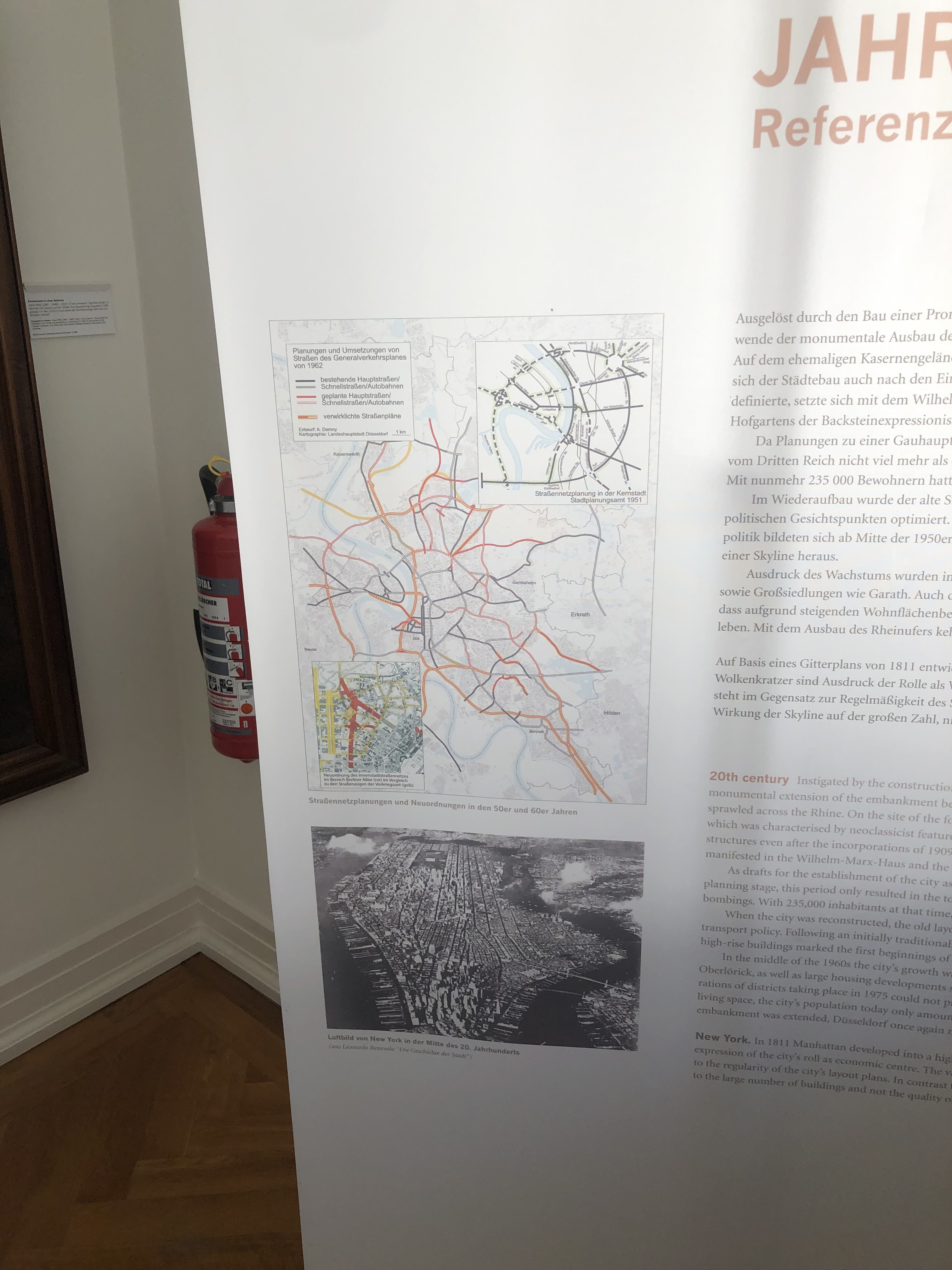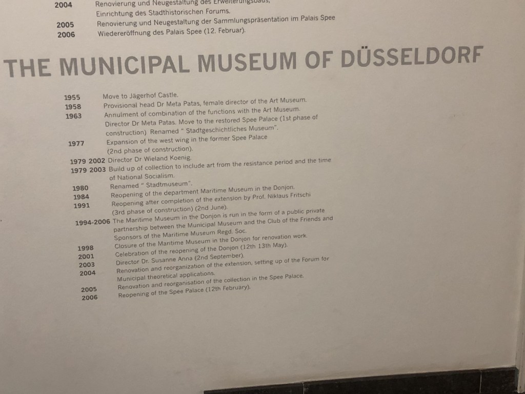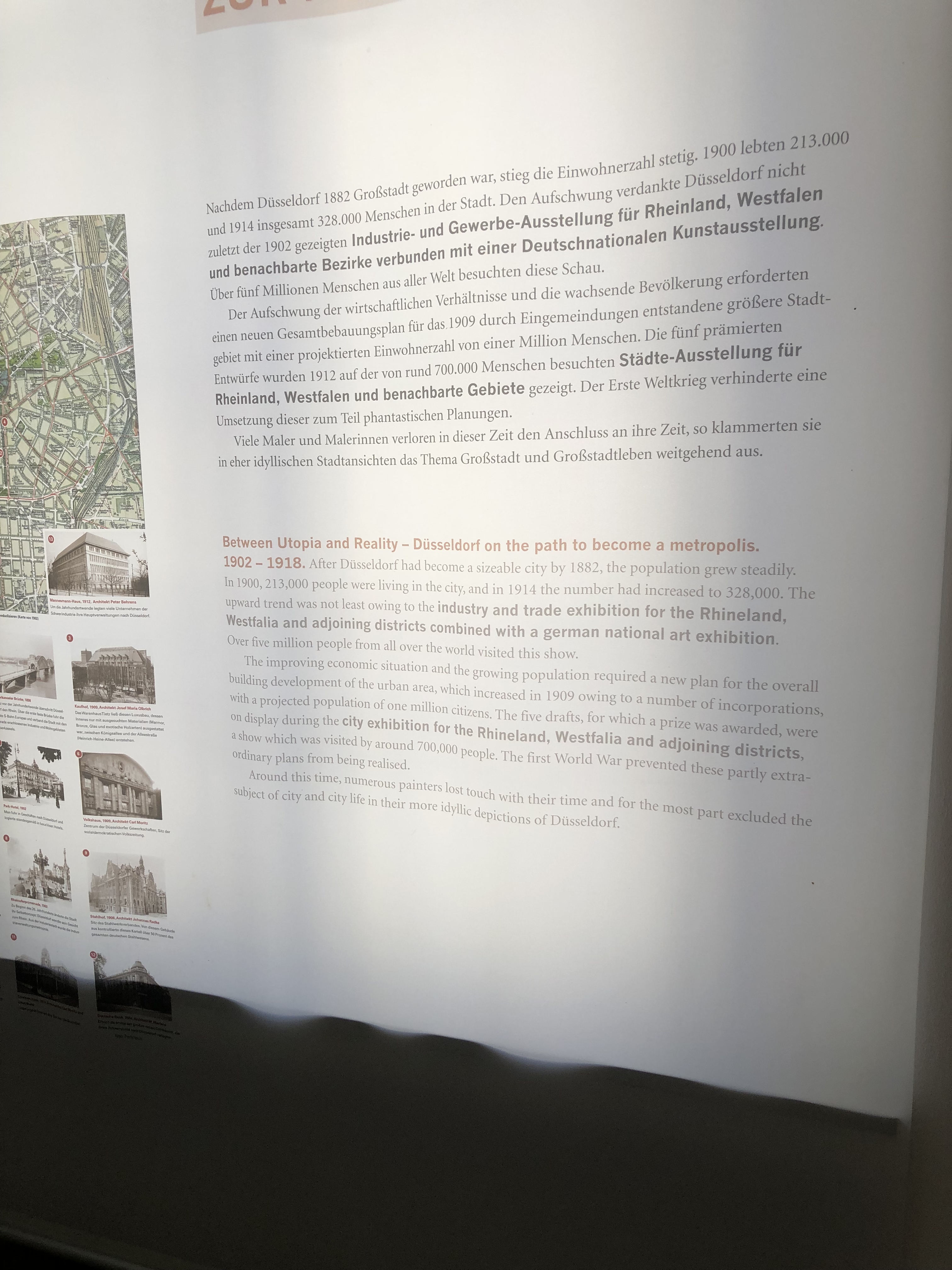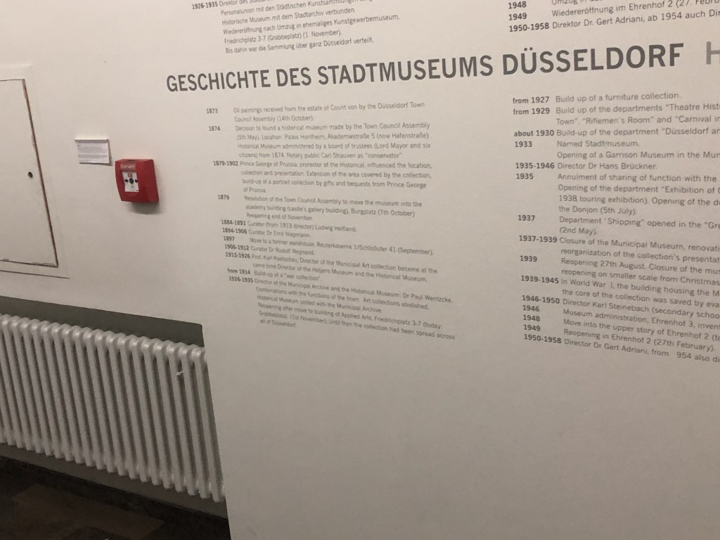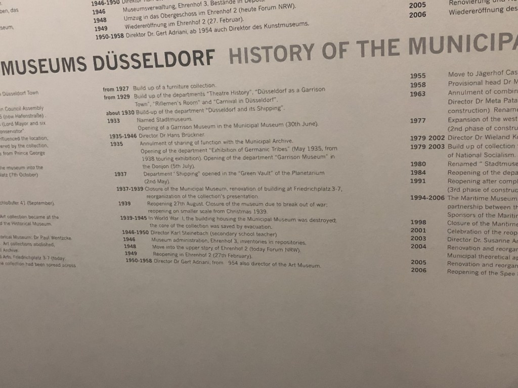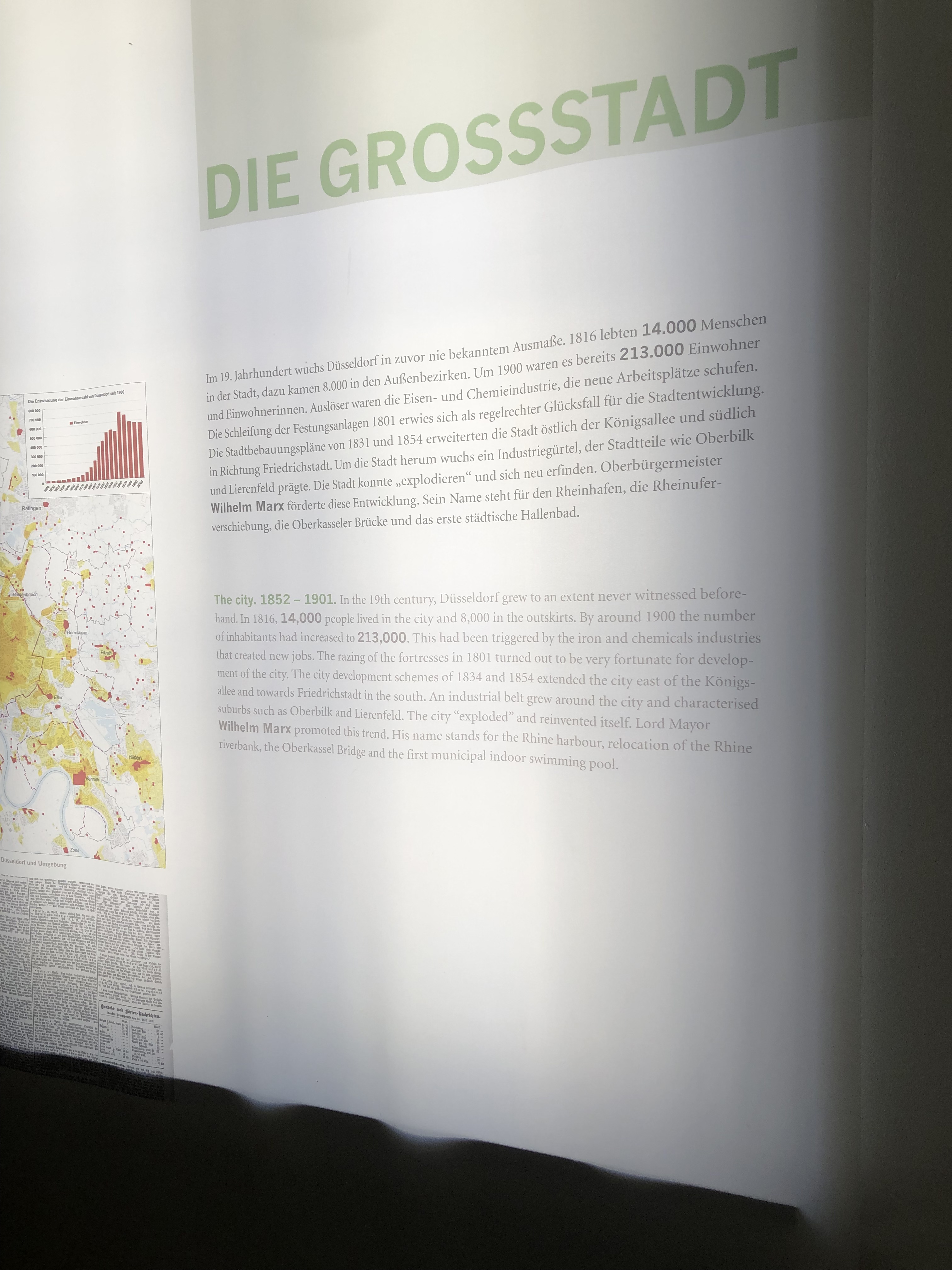 After getting set up in our hotel, and me reassuring someone outside it that a local pigeon hadn’t shat in her hair, we went by tram to the Stadtmuseum. It’s in the part of Düsseldorf that houses the Nordrhein-Westfalen government, and is well worth a visit if you want to understand how the city developed. So here are lots of photos, roughly in the order the history was described, along with some randomness, and here’s cyclemeter’s recording of our dribbling around Düsseldorf. (Ignore the time – I only just remembered to stop it.)