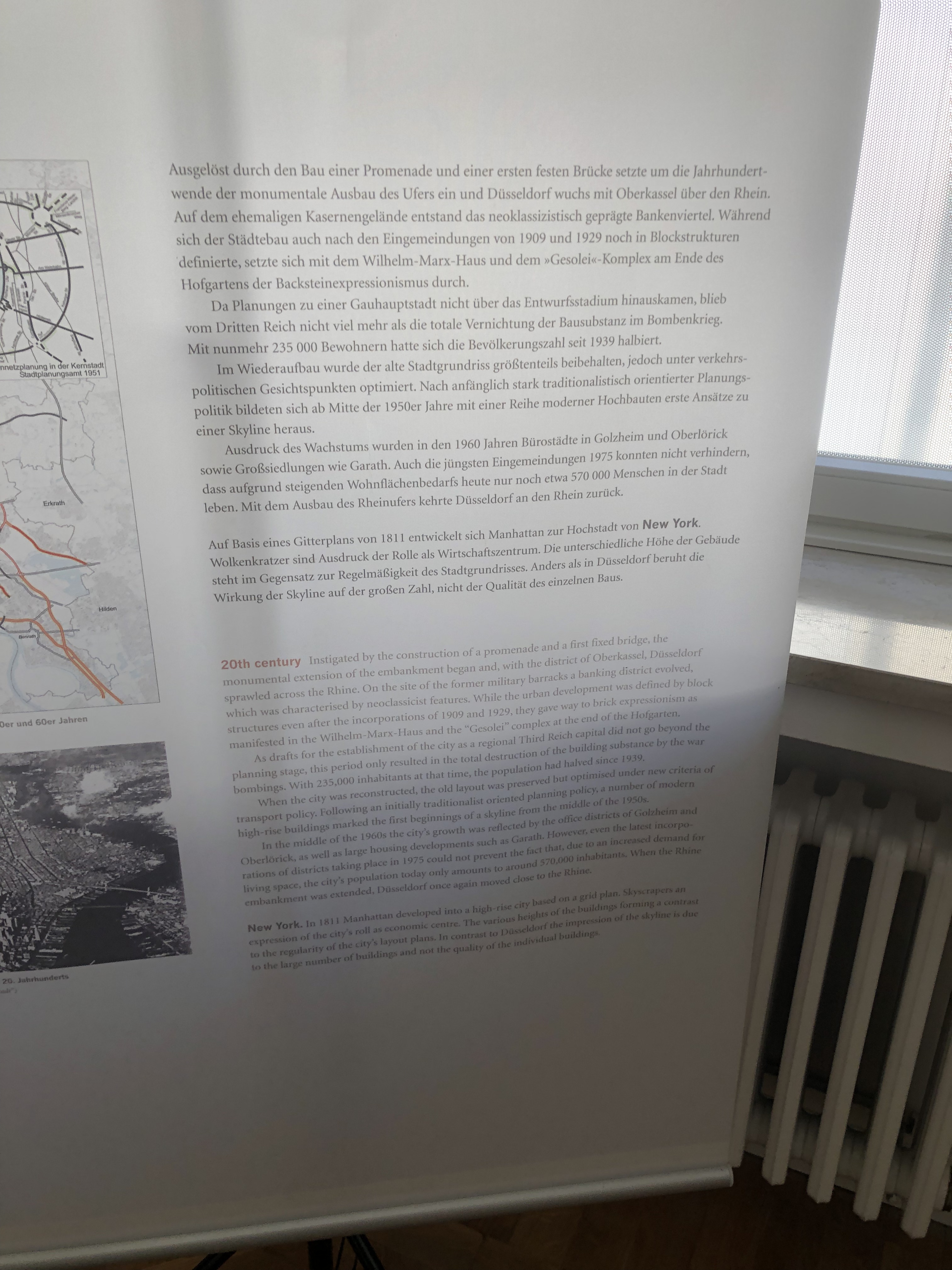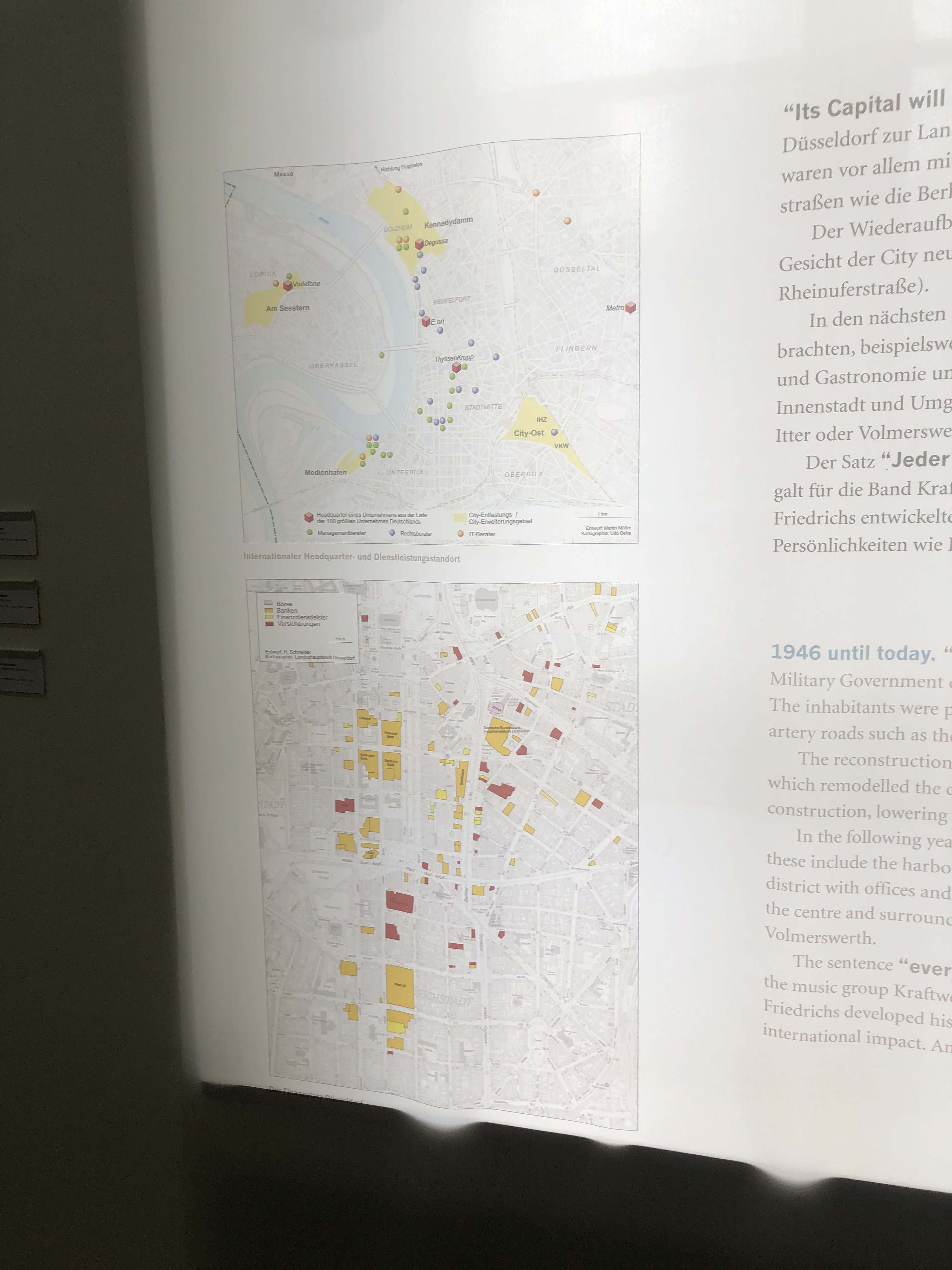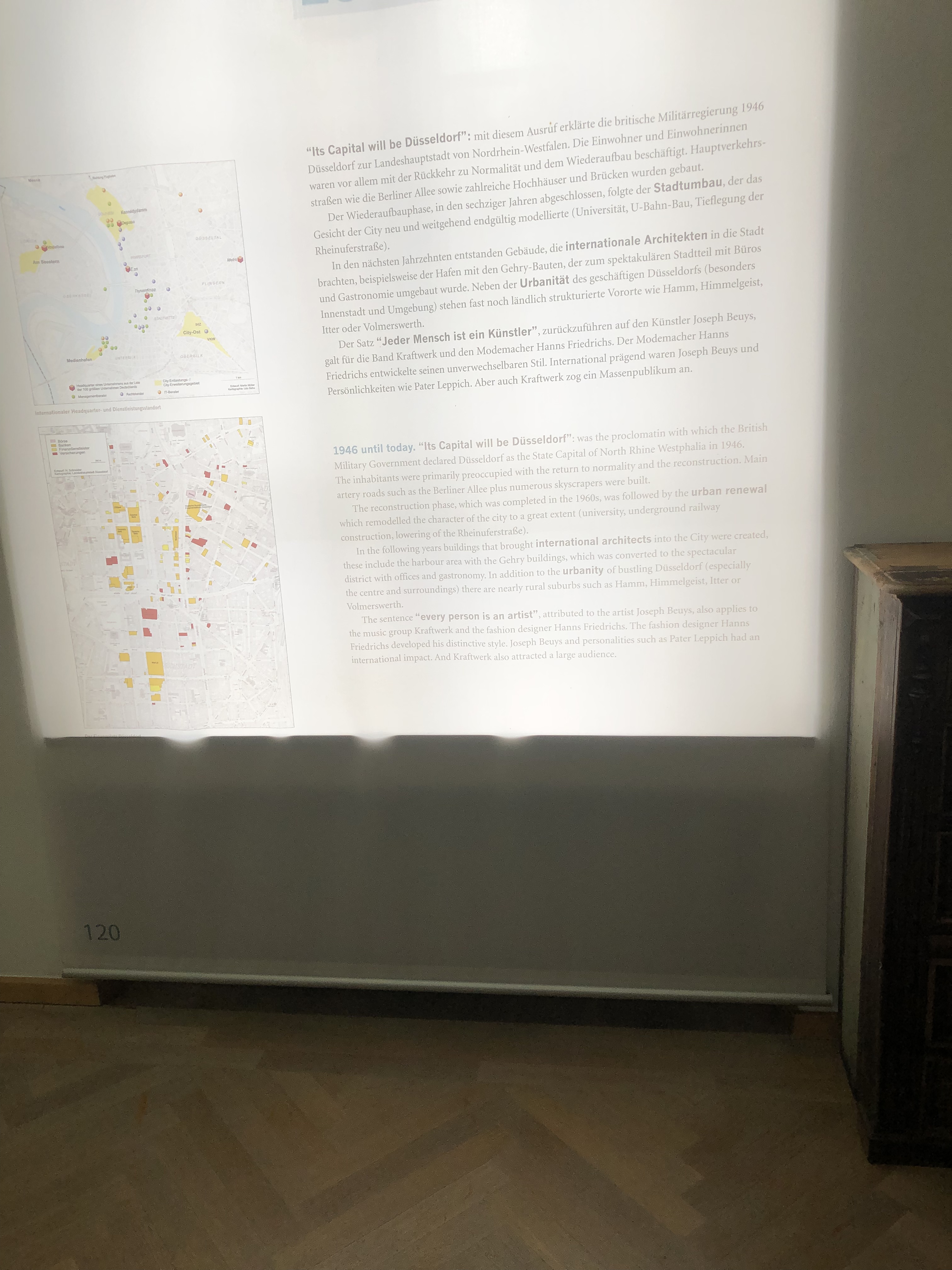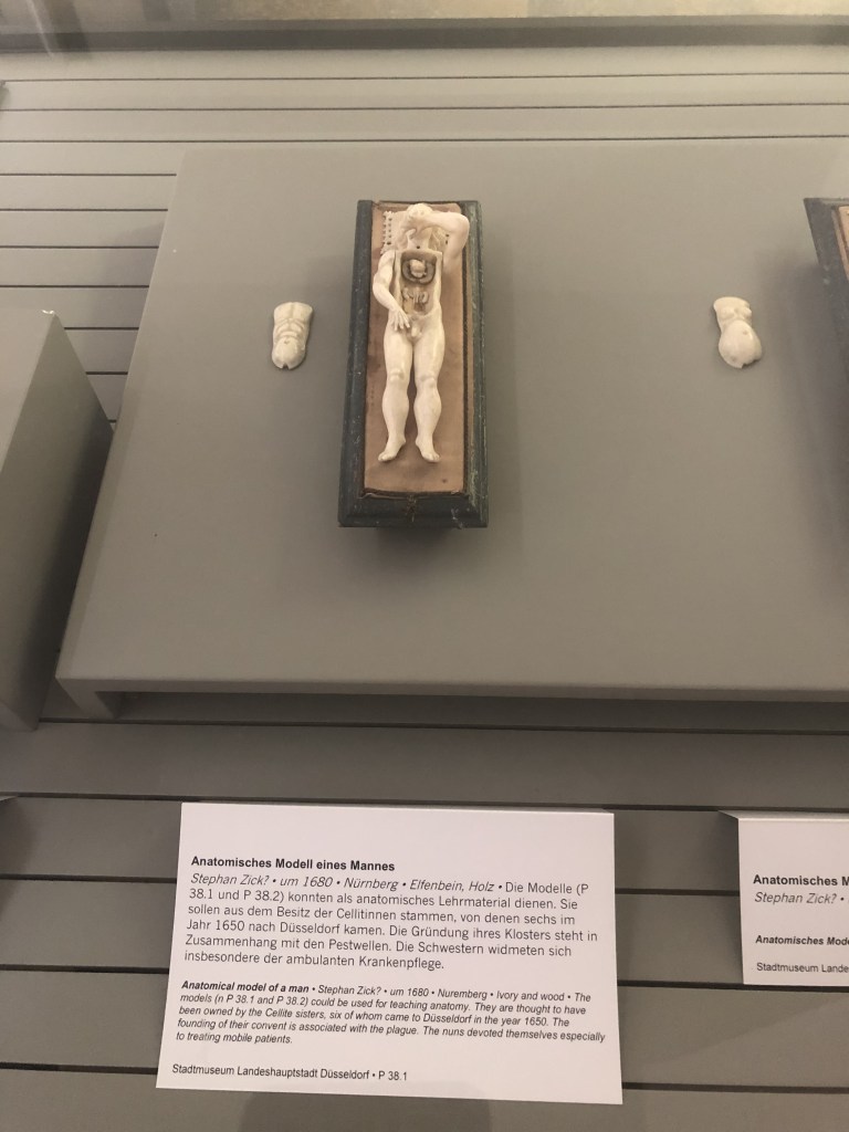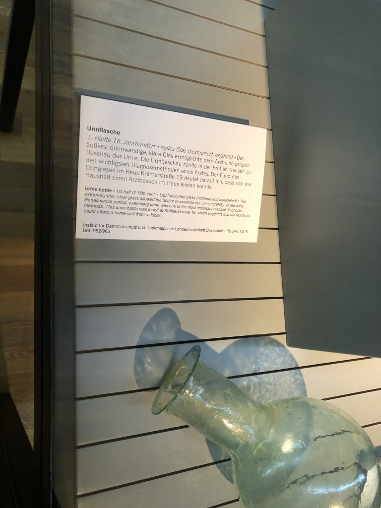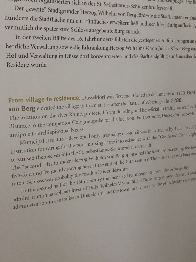 After getting set up in our hotel, and me reassuring someone outside it that a local pigeon hadn’t shat in her hair, we went by tram to the Stadtmuseum. It’s in the part of Düsseldorf that houses the Nordrhein-Westfalen government, and is well worth a visit if you want to understand how the city developed. So here are lots of photos, roughly in the order the history was described, along with some randomness, and here’s cyclemeter’s recording of our dribbling around Düsseldorf. (Ignore the time – I only just remembered to stop it.)