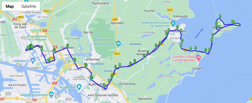 On one of our previous visits to Noord Holland, we went to Marken, a small island in the IJsselmeer. So we decided to go and see what has changed and how much we could remember. (It doesn’t help that I’m envisaging Reichenau in the Bodensee as I type this.) Cyclemeter captured our bus journeys there and back again, walking around the island, and then my evening peregrinations back in Zaandam.