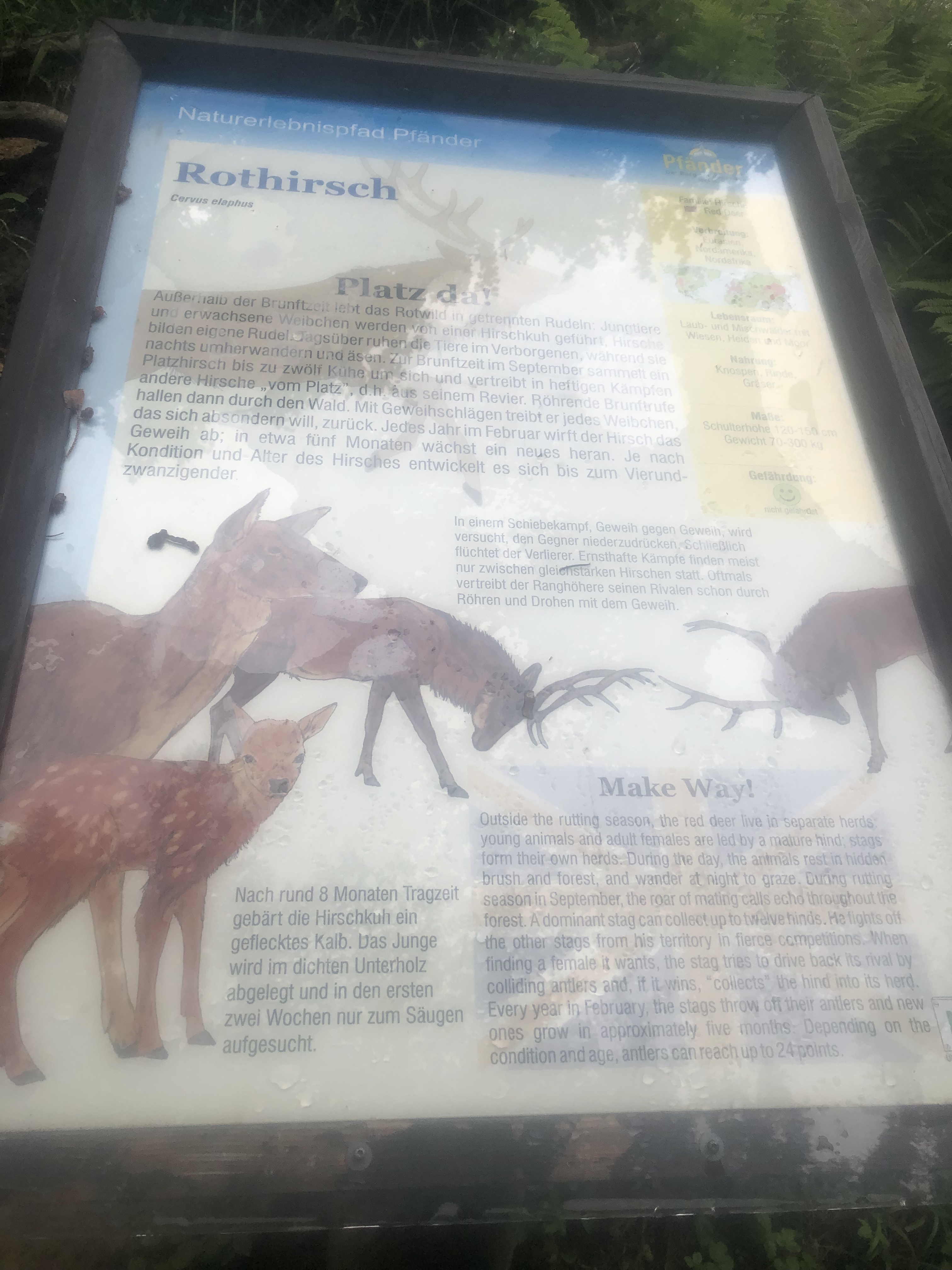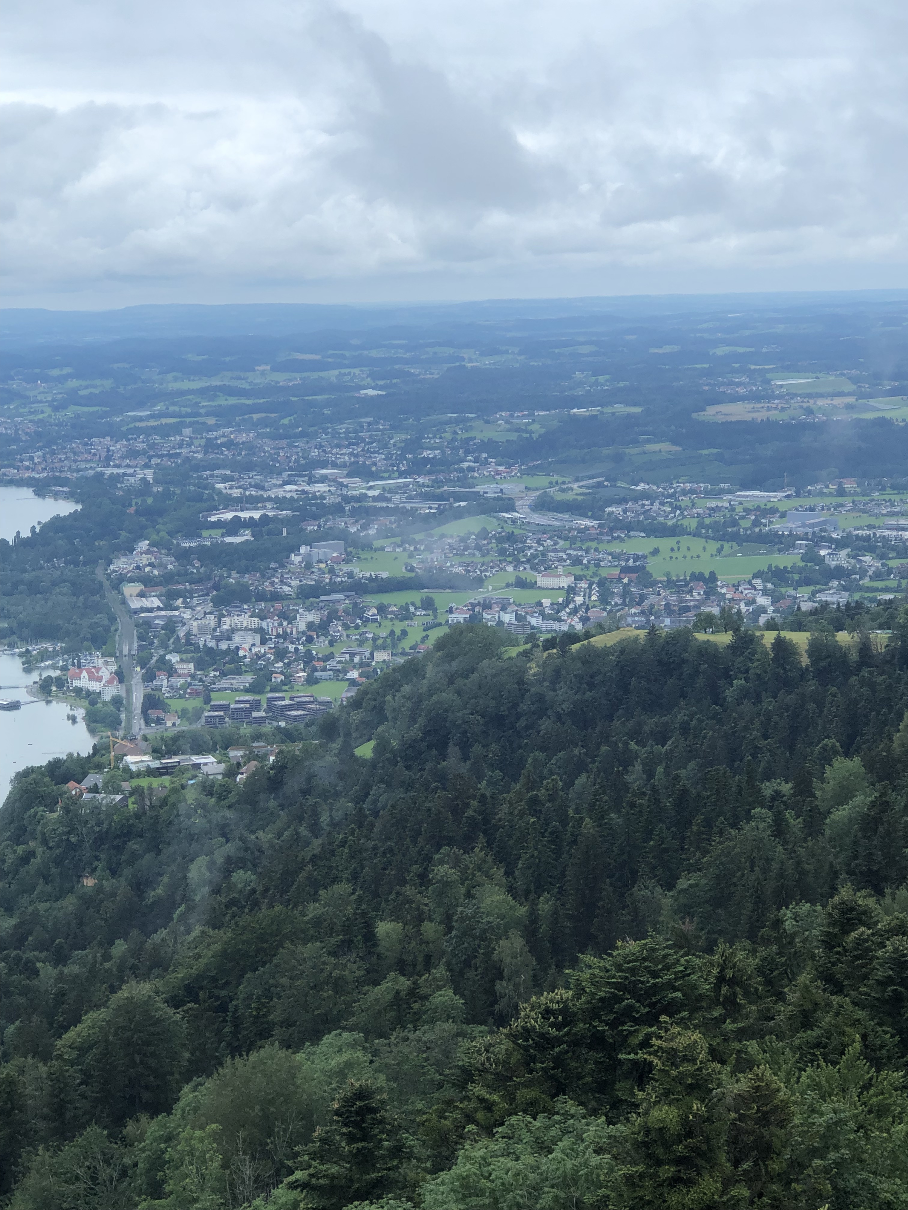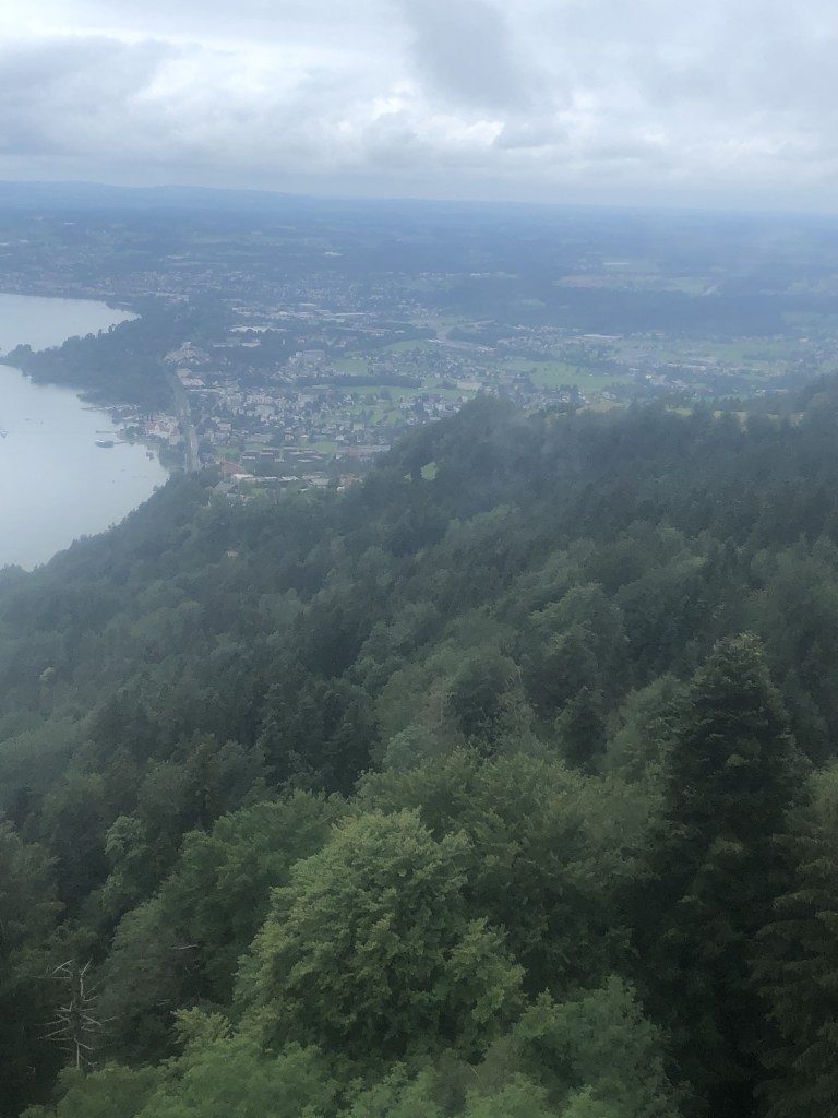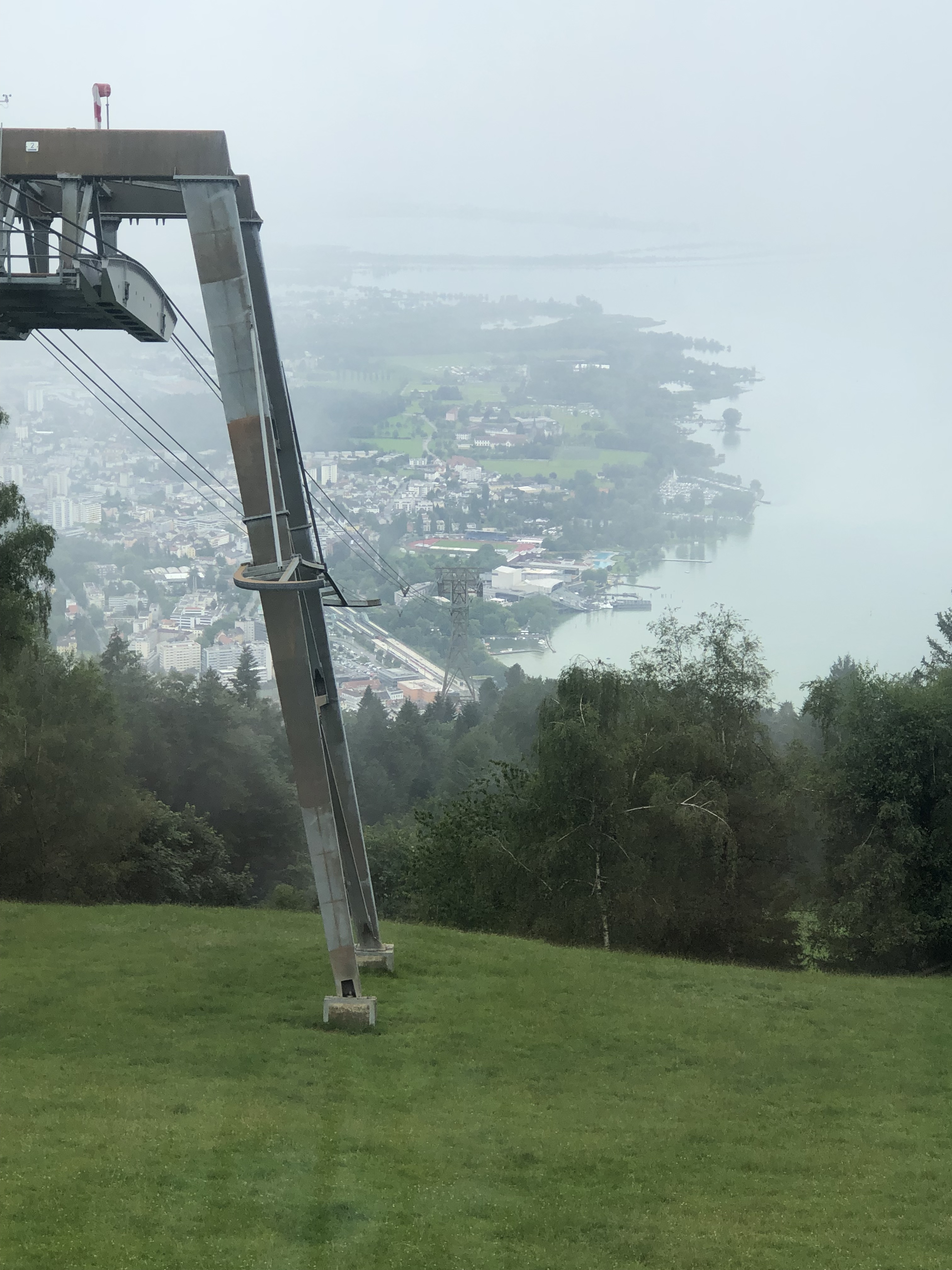 So today, despite starting off overcast and a bit damp, was fab. After a very late lie, we dragged ourselves to the Pfänderbahn, a cable car leading up a hill behind Bregenz. We were not optimistic we’d see much through the mist, and certainly not when we were almost last on to the car. However, at the top the cloud wan’t bad, and the animals were fun. (I’m generally not a fan of zoos that capture animals from vastly different climates for humans to goggle at, but the animals here were all native to this area, and didn’t seem to be maltreated, at least not to my ignorant eyes.) Of course the Wildschweine were the best. (See the movie in this tweet.)
