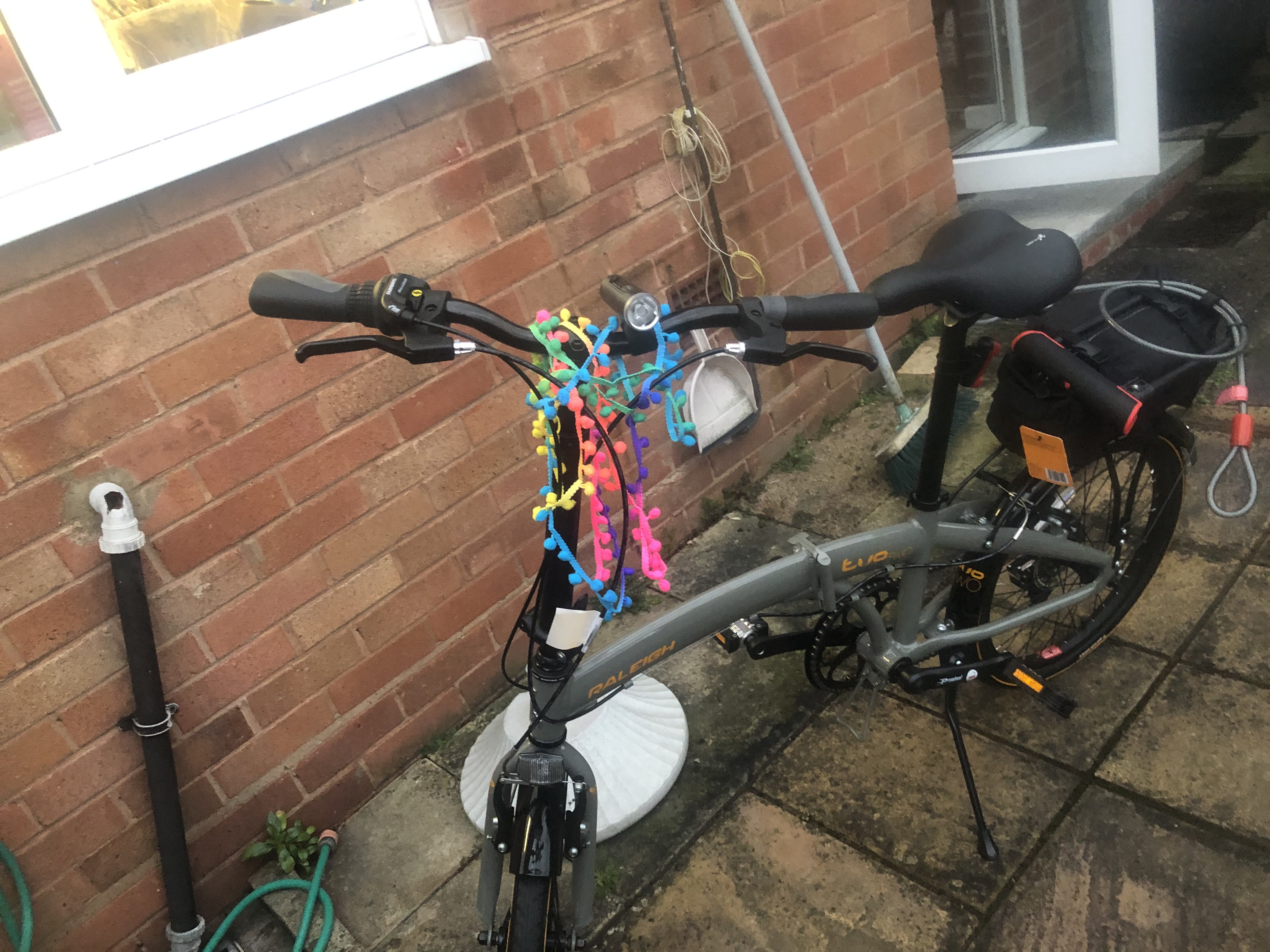 eleanor.scot understood that I need an easy way to travel in Worcester that doesn’t involve bringing Lev Davidovitch Bikestein here. His home is Edinburgh, although he does love European jaunts and he has been known to take me from Birmingham New St station to Worcester. Add to that it’s just a PITA to book bike-spaces on trains. So ever-wonderful eleanor.scot has bought me a folding bike for my birthday! Accessories are from my mother, sister and brother.