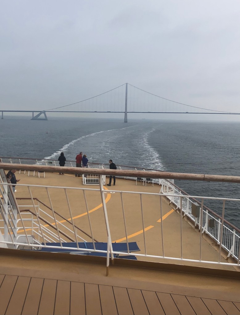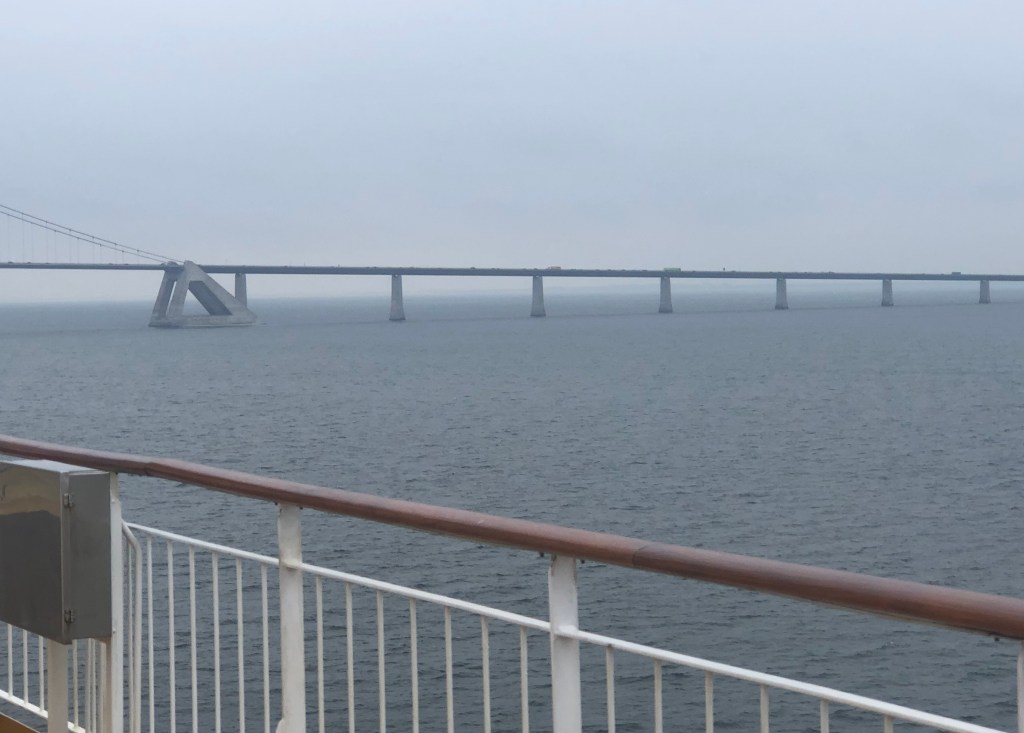 As we set off, we watched progress from the forward observation-lounge. We were tempted on deck for cigarettes (well I was) and to watch as we passed under the Nyborg-Halsskov (‘Great Belt’) bridge. It’s truly magnificent, but I doubt my photos do it justice. By then, my blood-sugar was calling out for pizza. In addition to all the posh shops and restaurants, there was a pizza-bar selling (among other types) pizza with vegan cheese.