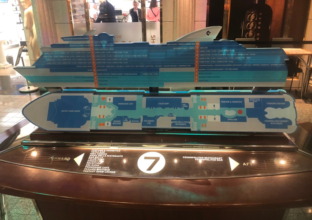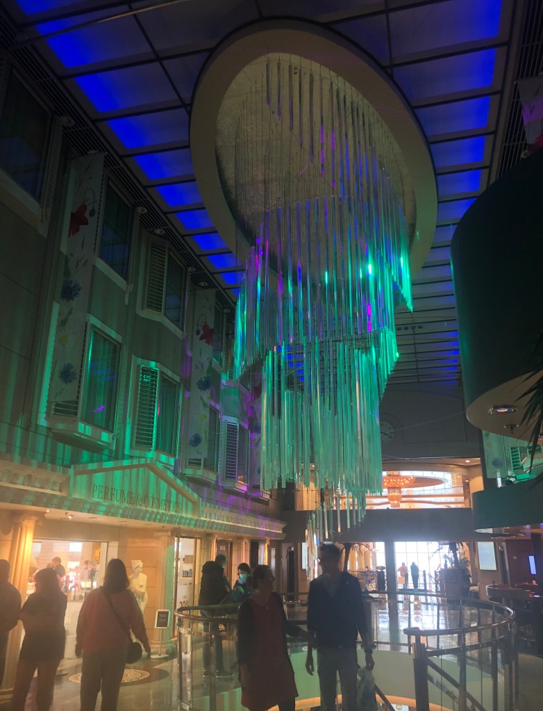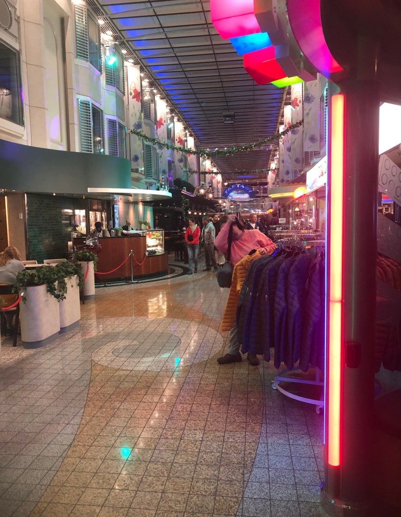 The ship itself is crazy. Imagine a vey posh version of the shops you are forced to go through between check-in and gate at an airport, but with lifts from a colour version of Metropolis, rooms that are the same size as a budget hotel but as posh as a 5-star, all piled onto a ship as big as a major oil tanker, with superstructure so high you could bungee-jump from the bridge.