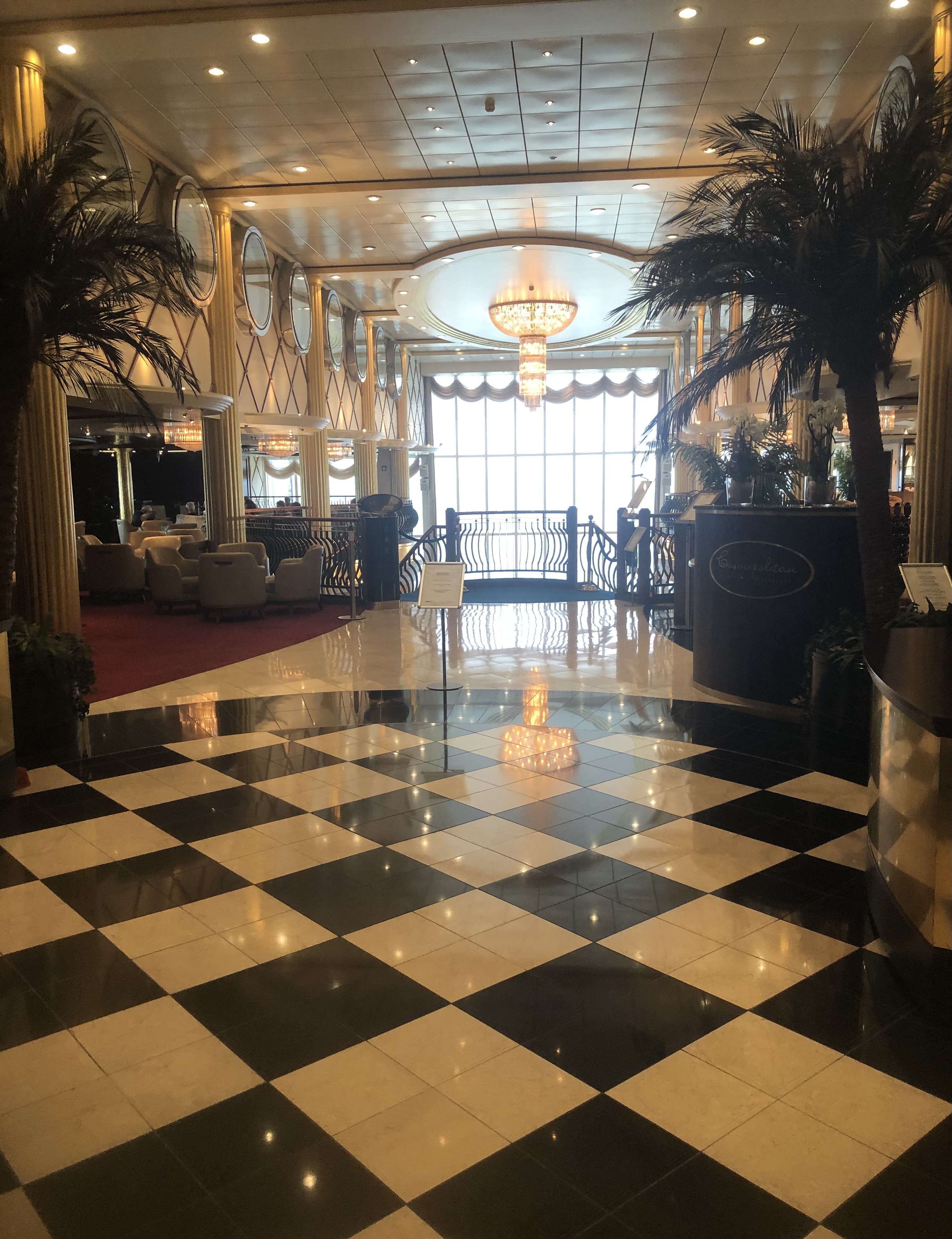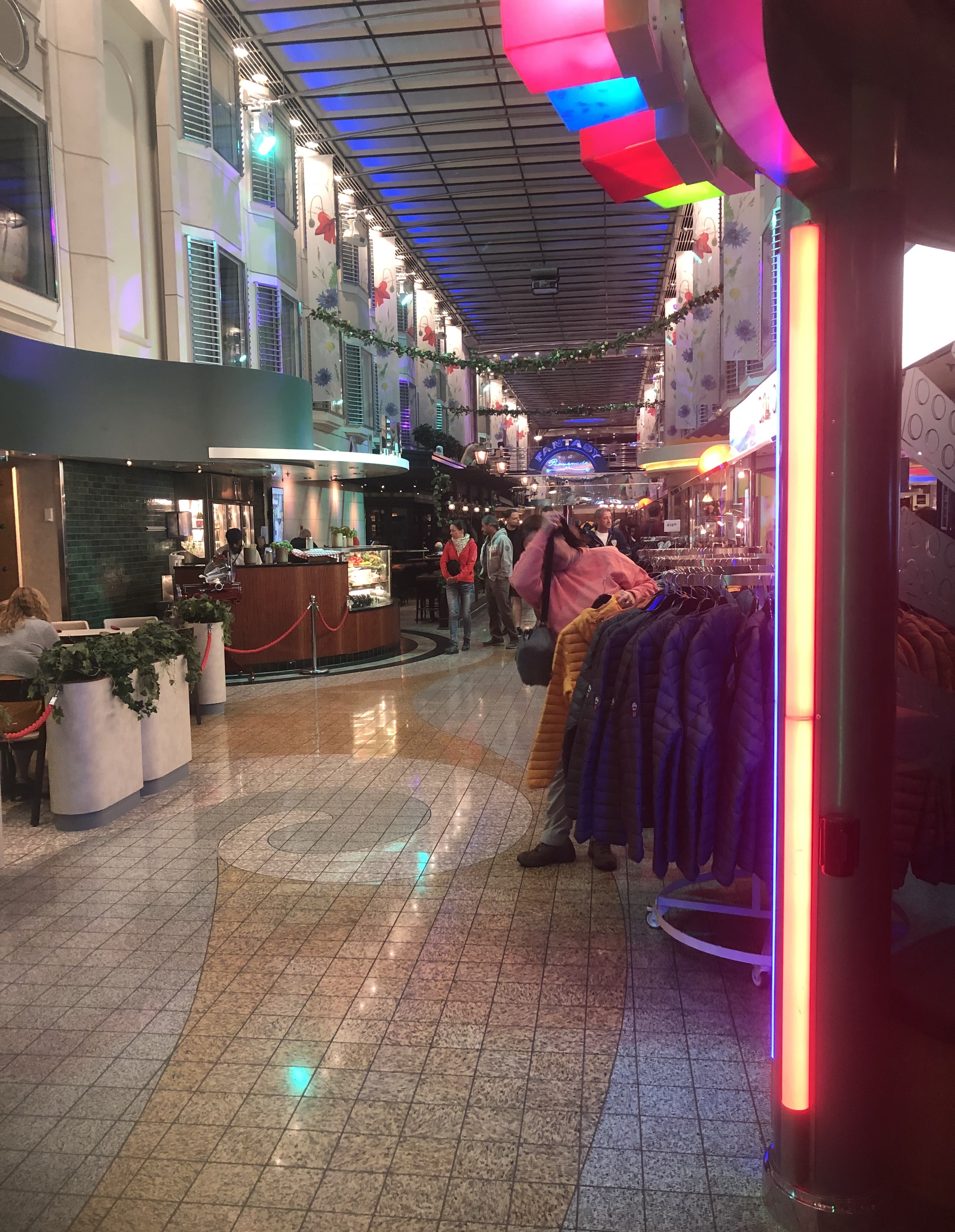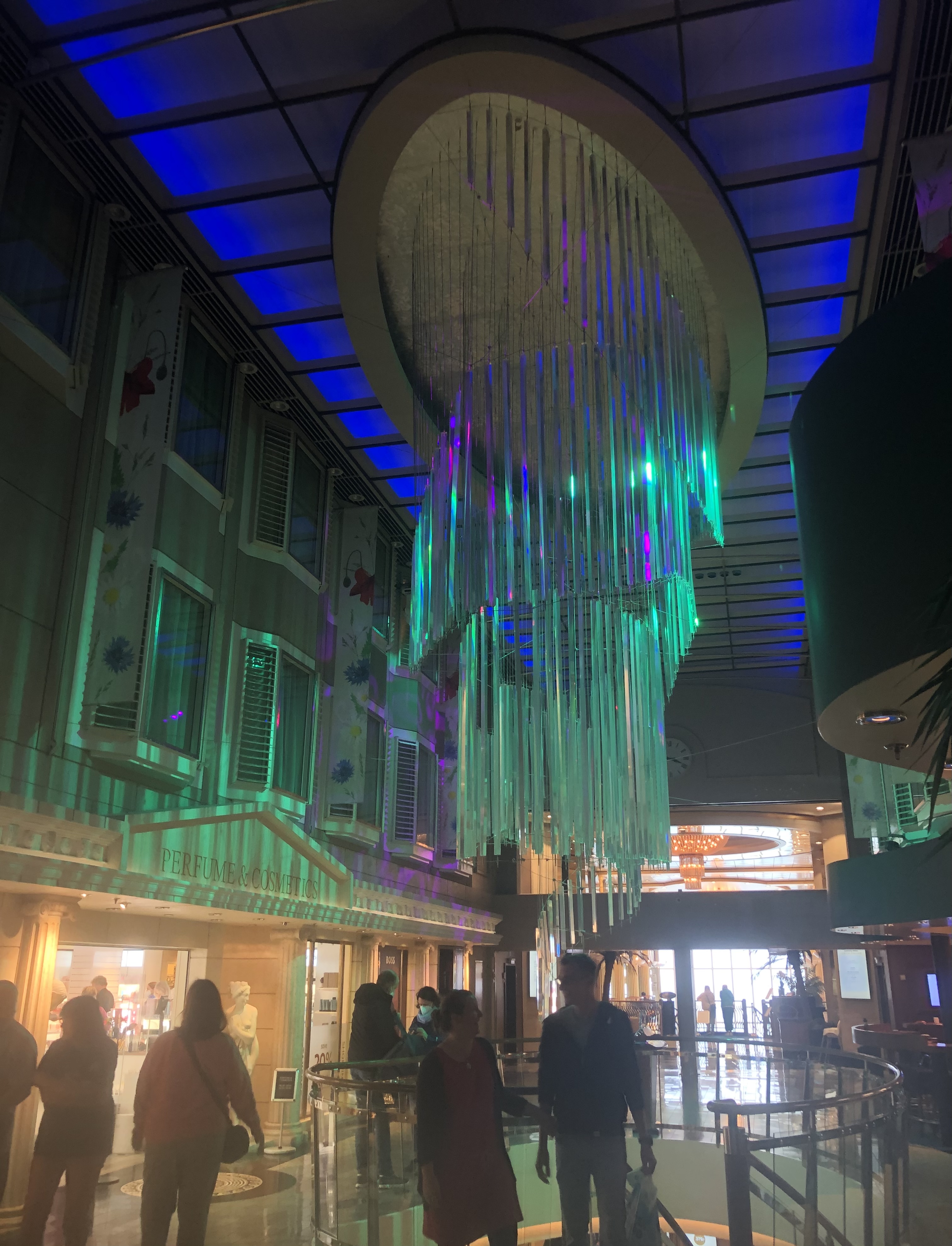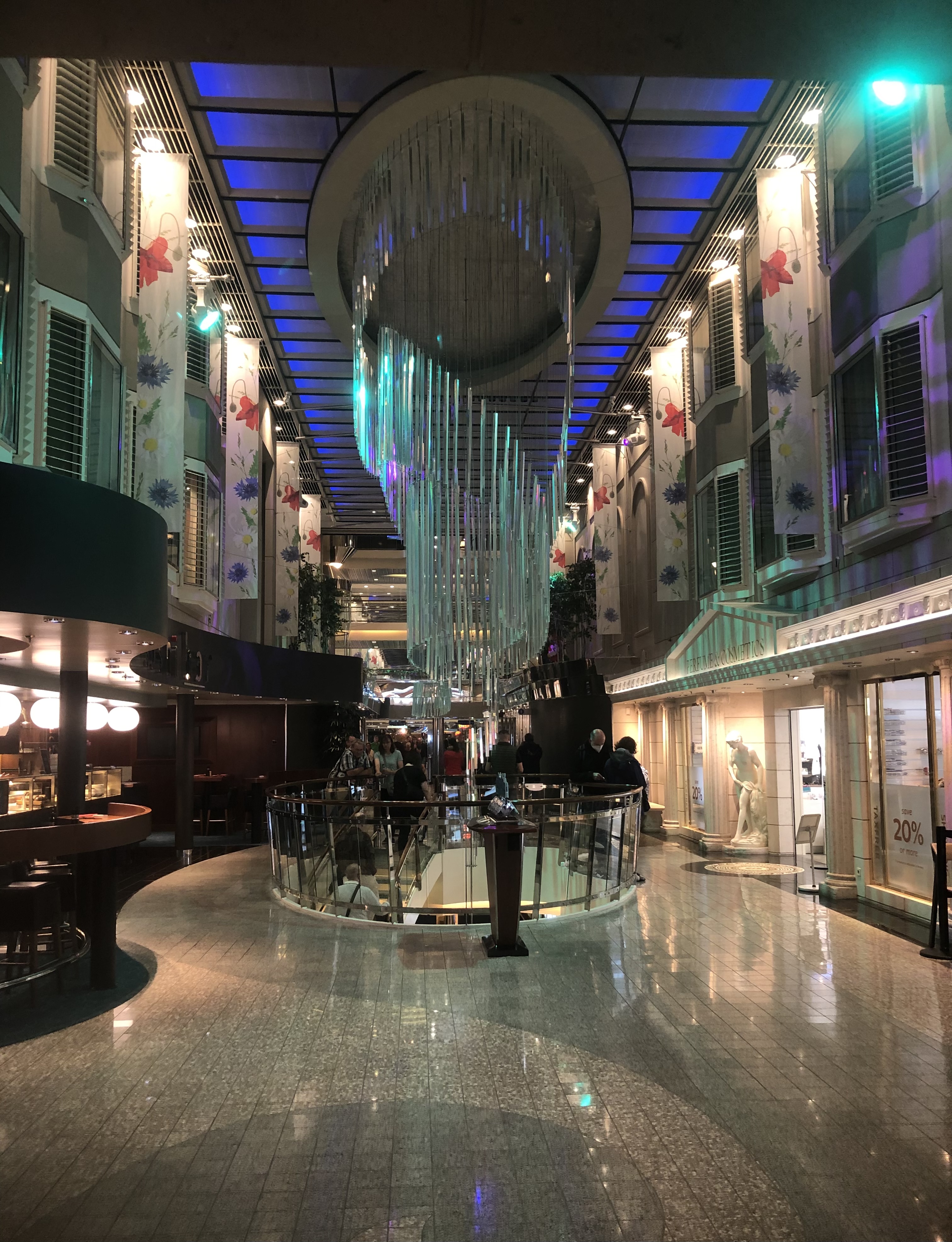 The ship itself is crazy. Imagine a vey posh version of the shops you are forced to go through between check-in and gate at an airport, but with lifts from a colour version of Metropolis, rooms that are the same size as a budget hotel but as posh as a 5-star, all piled onto a ship as big as a major oil tanker, with superstructure so high you could bungee-jump from the bridge.